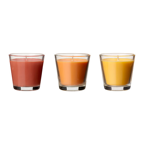 Když svíčka vyhoří, miska se dá použít jako stojan na čajové svíčky. http://www.ikea.com/cz/cs/images/products/tindra-ljuv-vonna-svicka-ve-skle__0170345_PE324392_S4.JPG TINDRA LJUV Vonná svíčka ve skle, oranžová 202.118.22 IKEA 79,-/ 3 ks