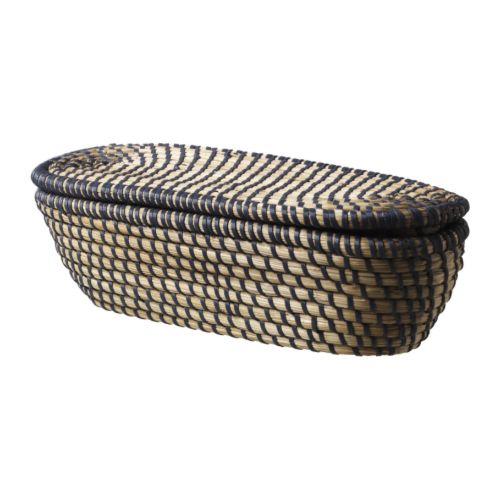 Håndlavet. Hver kurv er unik. http://www.ikea.com/dk/da/images/products/asunden-kurv-med-lag__0098947_PE240339_S4.JPG ÅSUNDEN Kurv med låg, mørkegrå, oval 701.700.65 IKEA 49.-/ stk.
