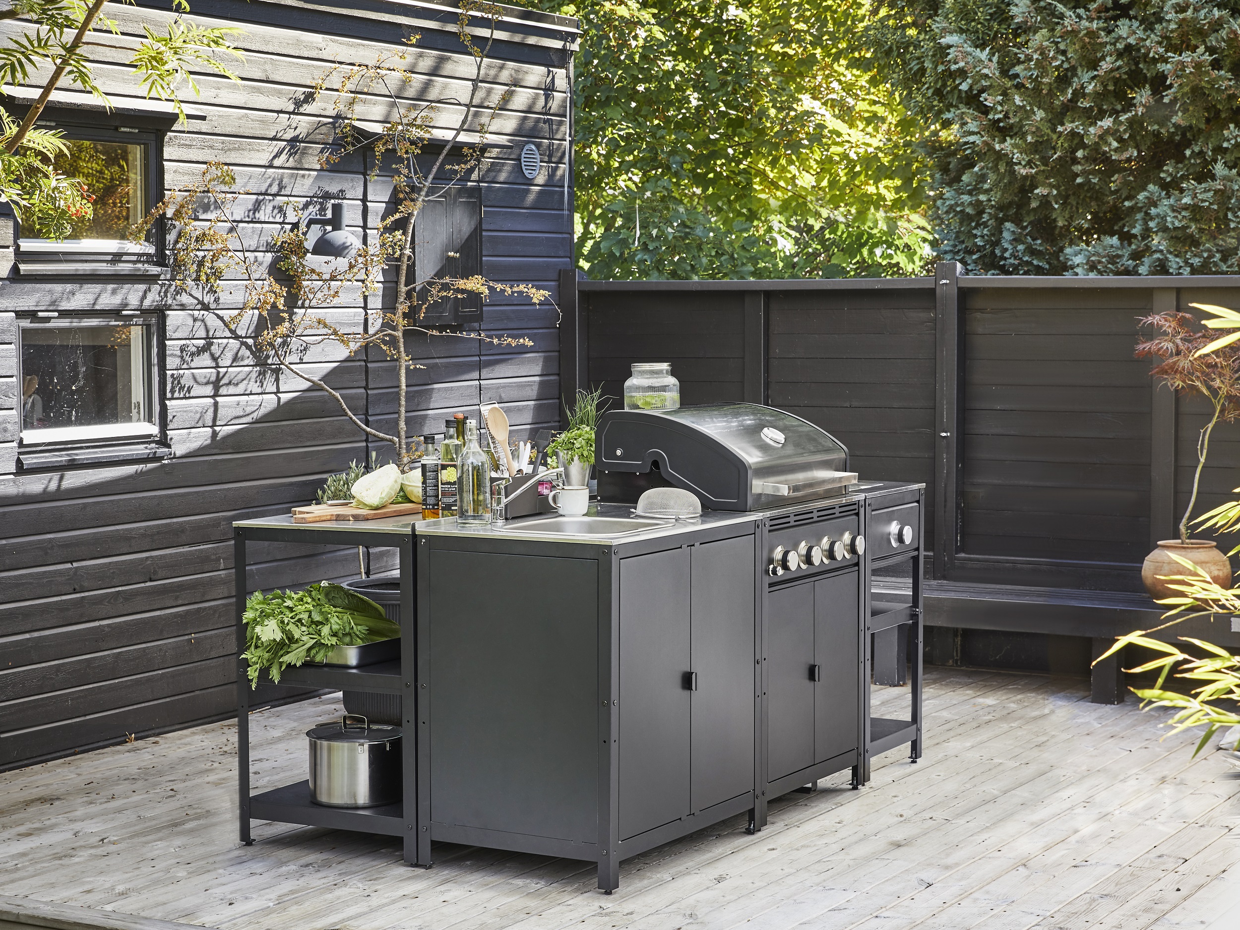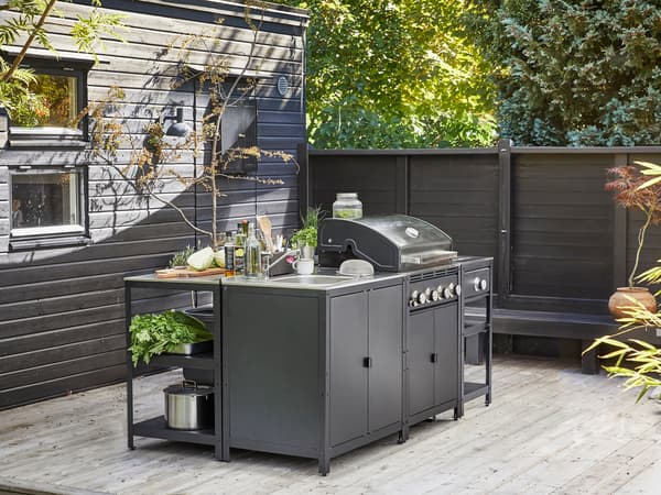 Das erweiterte Grillsortiment von IKEA überzeugt besonders durch die Möglichkeit der Individualisierung: Der neue GRILLSKÄR Gasgrill kann beispielsweise mit ein bis zwei Beistelltischen oder einer ganzen Kücheninsel kombiniert werden. Mit verschiedenen Modulen kann so die Outdoor-Küche nach eigenen Wünschen zusammengestellt und mit den passenden Outdoor-Möbeln perfekt abgerundet werden.