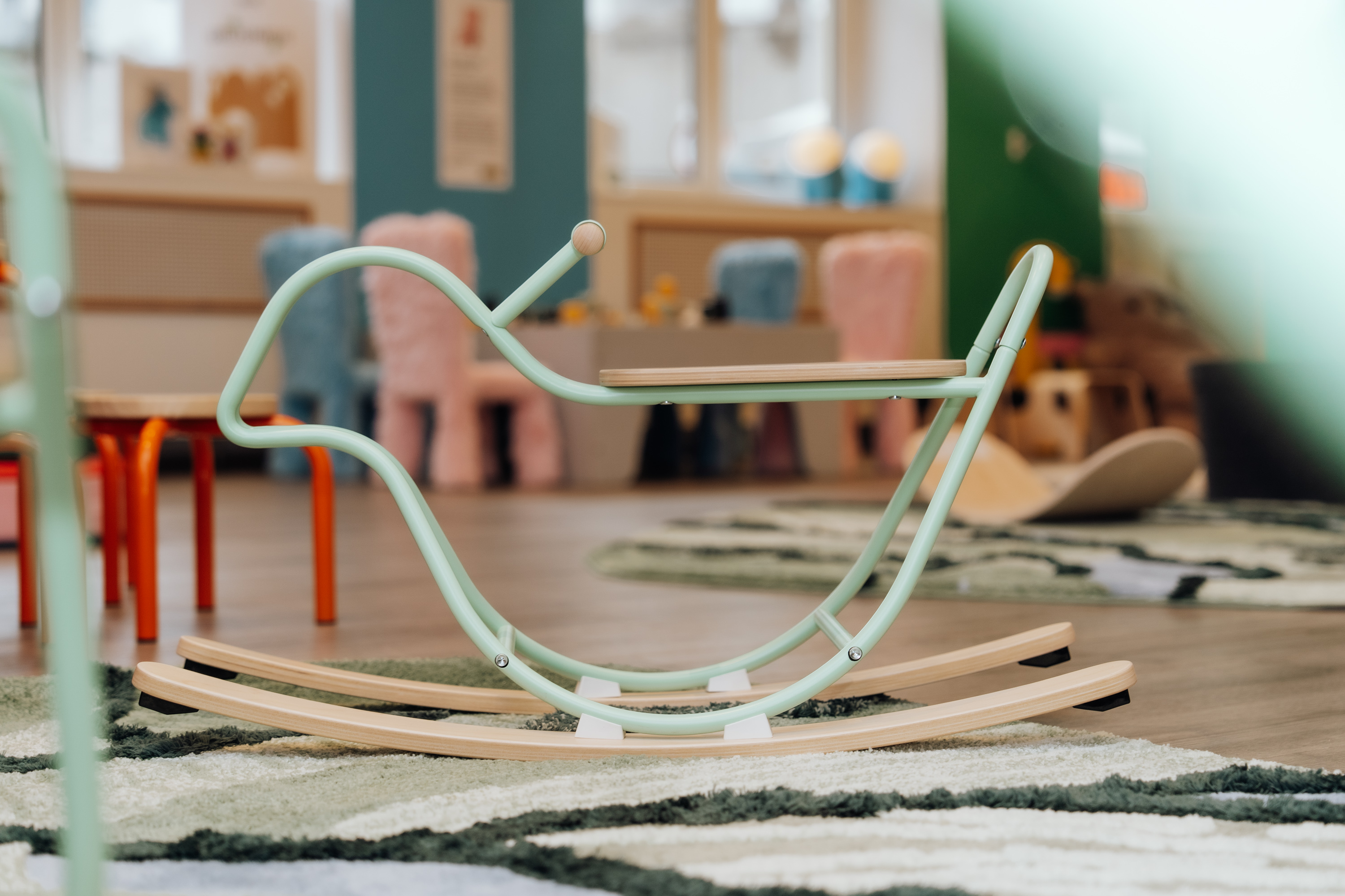 GREJSIMOJS – schwedisch für „Krimskrams“ oder „Dingsbums“ – steht für bewusst offene, spielanregende Designs wie kuschelige Teddybären, Bastelmaterial, Stapel- und Steckspiele sowie Balance- und Schaukelelemente aus Holz.