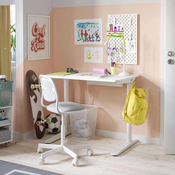 Auch auf dem stabilen Schreibtischstuhl LOBERGET/MALSKÄR sitzen Schulkinder und Studierende bequem – sei es beim Basteln oder beim Schreiben der Seminararbeit. Der Stuhl ist höhenverstellbar und passt mit seinem modernen, schlichten Design zu jedem Einrichtungsstil.