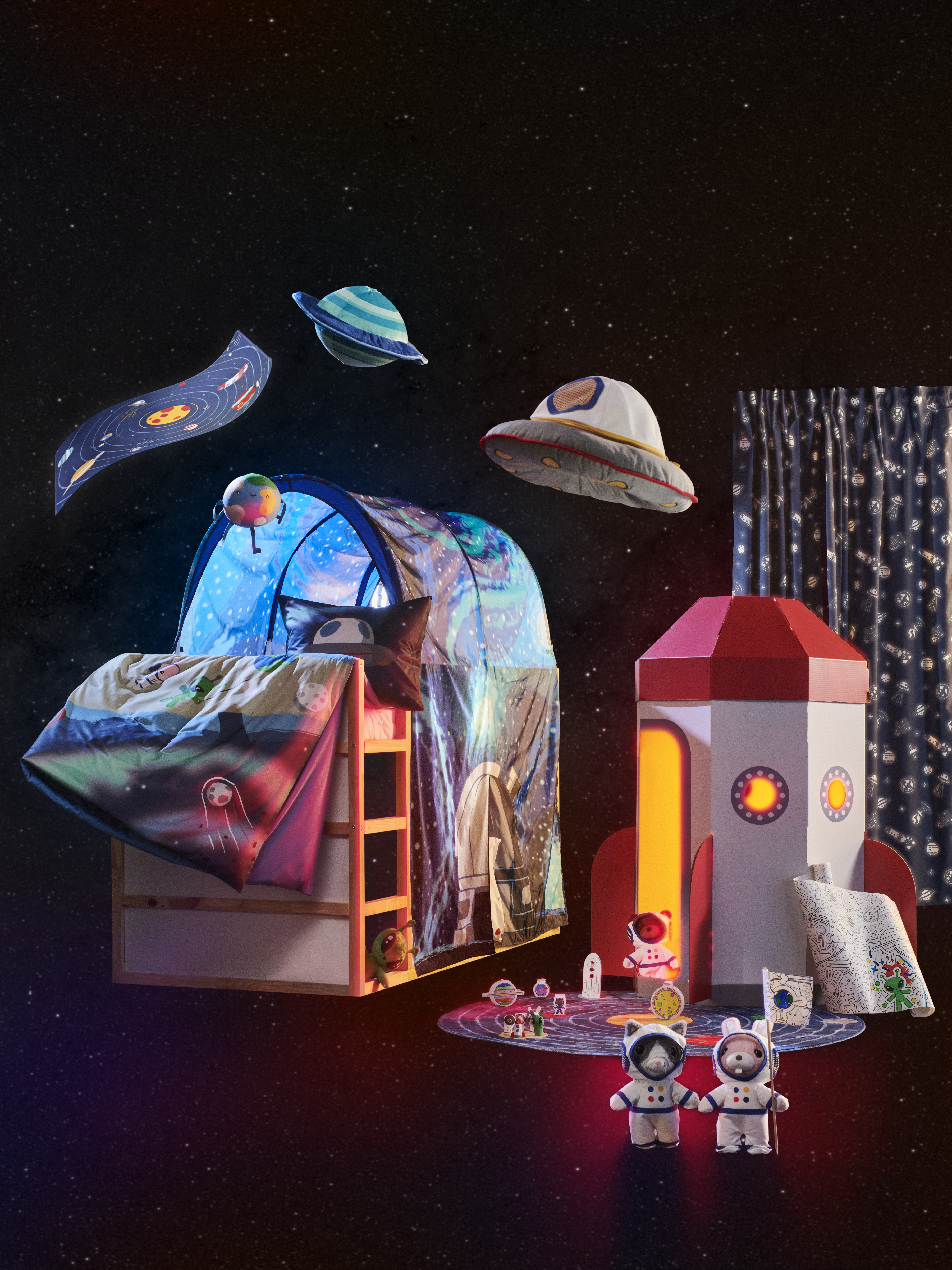 The collection features everything to kick start an adventure into outer space, including a solar system bed tent for kids to drift off to sleep under the stars. AFTONSPARV also features soft-toy astronauts and aliens, finger puppets (from $10), duvets and pillow covers (from $29) – all made from 100% recycled polyester – as well as a cardboard rocket play tent ($40), planet and rocket lamps (from $35) and a glowin-the-dark curtain ($40).