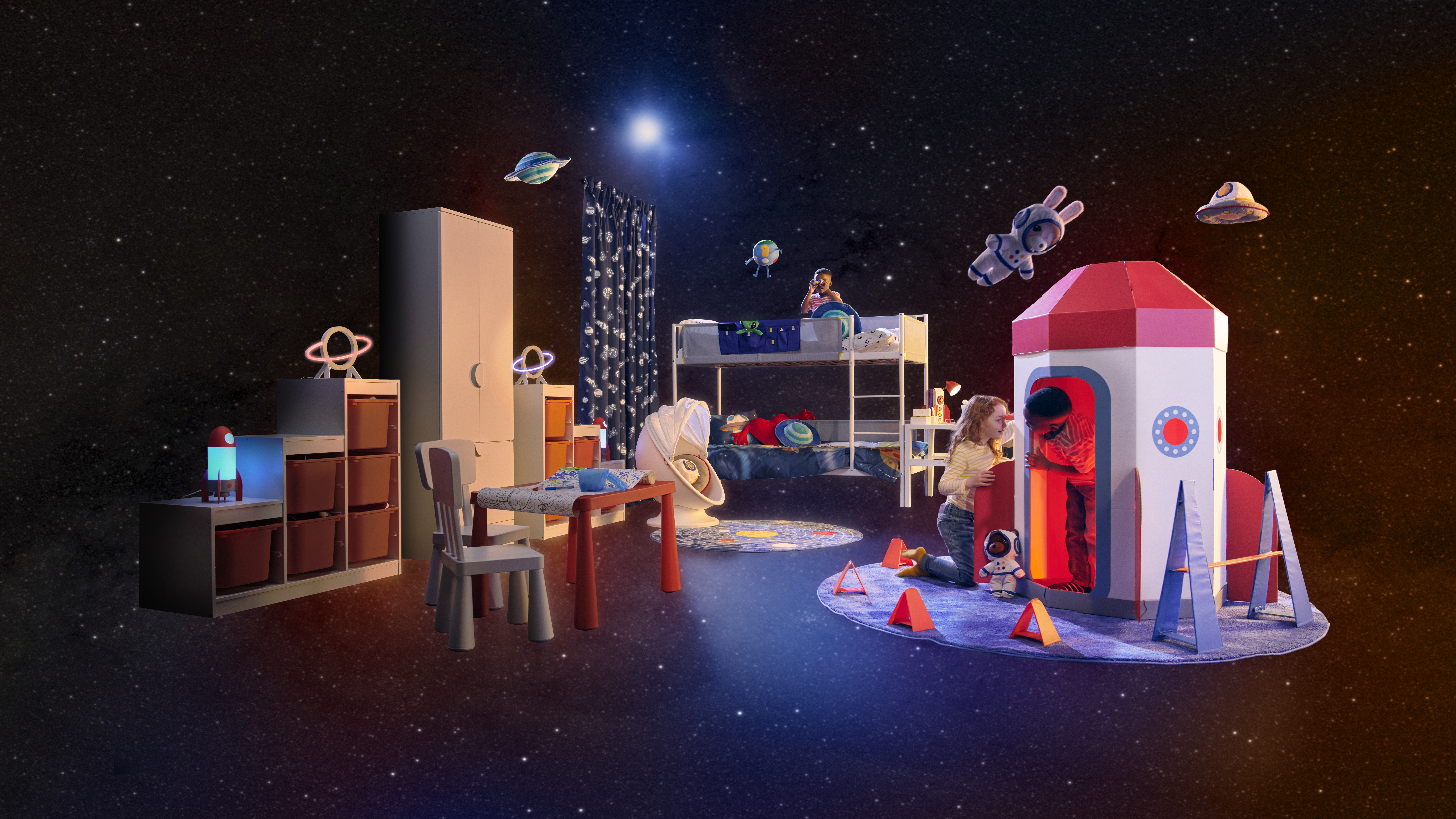 The ideas behind the new AFTONSPARV collection were developed through workshops run by IKEA with a group of young space enthusiasts, between the ages of 3 and 7, based on the belief that children are the experts in what they like and need. This space-themed range offers lots of room for creativity and play, much like the exciting and vast mystical world of the outer space.