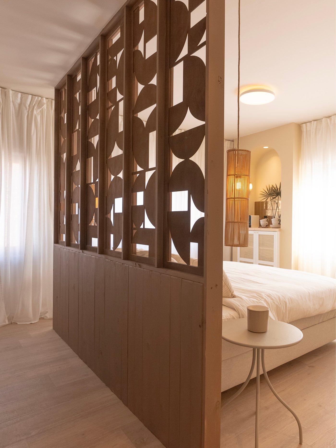 Une chambre à coucher désuète a été totalement transformée en suite de luxe avec salle de bain intégrée. Les murs se parent de teintes terreuses apaisantes, tandis qu’un éclairage subtil emplit la pièce d’une lueur chaleureuse. Le lit accroche le regard avec une tête de lit haute et du linge de lit luxueux. Un coin salon accueillant composé de fauteuils moelleux et d’une table basse élégante apporte la touche finale.