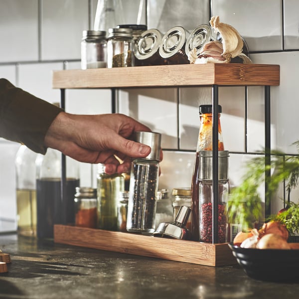 - Create multi-level storage with storage racks: NÅLBLECKA rack keeps jars, spice grinders and bottles in their own place, so you always know where to find them. Vertical storage maximises counter space whilst maintaining order and style.