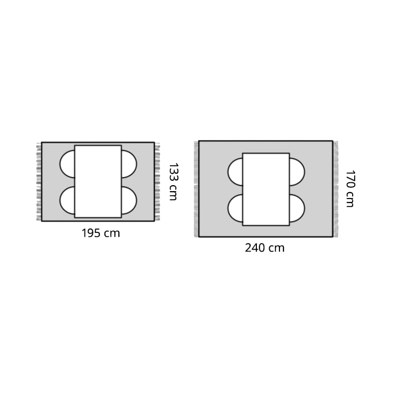 - Alfonbrak mahaia eta aulkiak batera baino handiagoa izan behar du, baita aulkiak zabalduta daudenean ere. Adibidez, pertsona batek batez beste 75 cm hartzen baditu, alfonbrak gutxienez metro bat gehiago hartu beharko luke alde bakoitzeko, mahaiko aulkiekin.