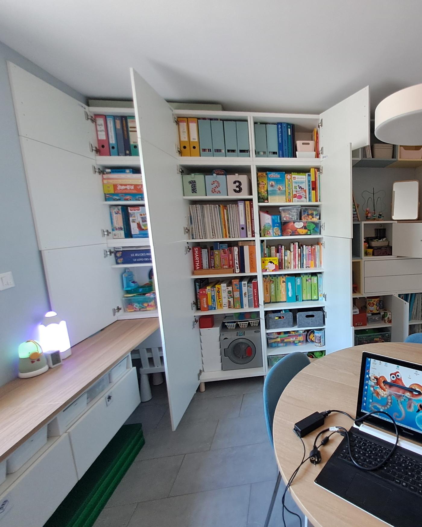 Le mur droit du bureau est dédié au rangement optimisé pour répondre aux besoins de Stéphanie. La série BESTÅ, avec une profondeur de 40 cm, sert à dissimuler les jeux hors de portée des enfants, grâce à des étagères ajustables et des boîtes pour organiser l’intérieur.