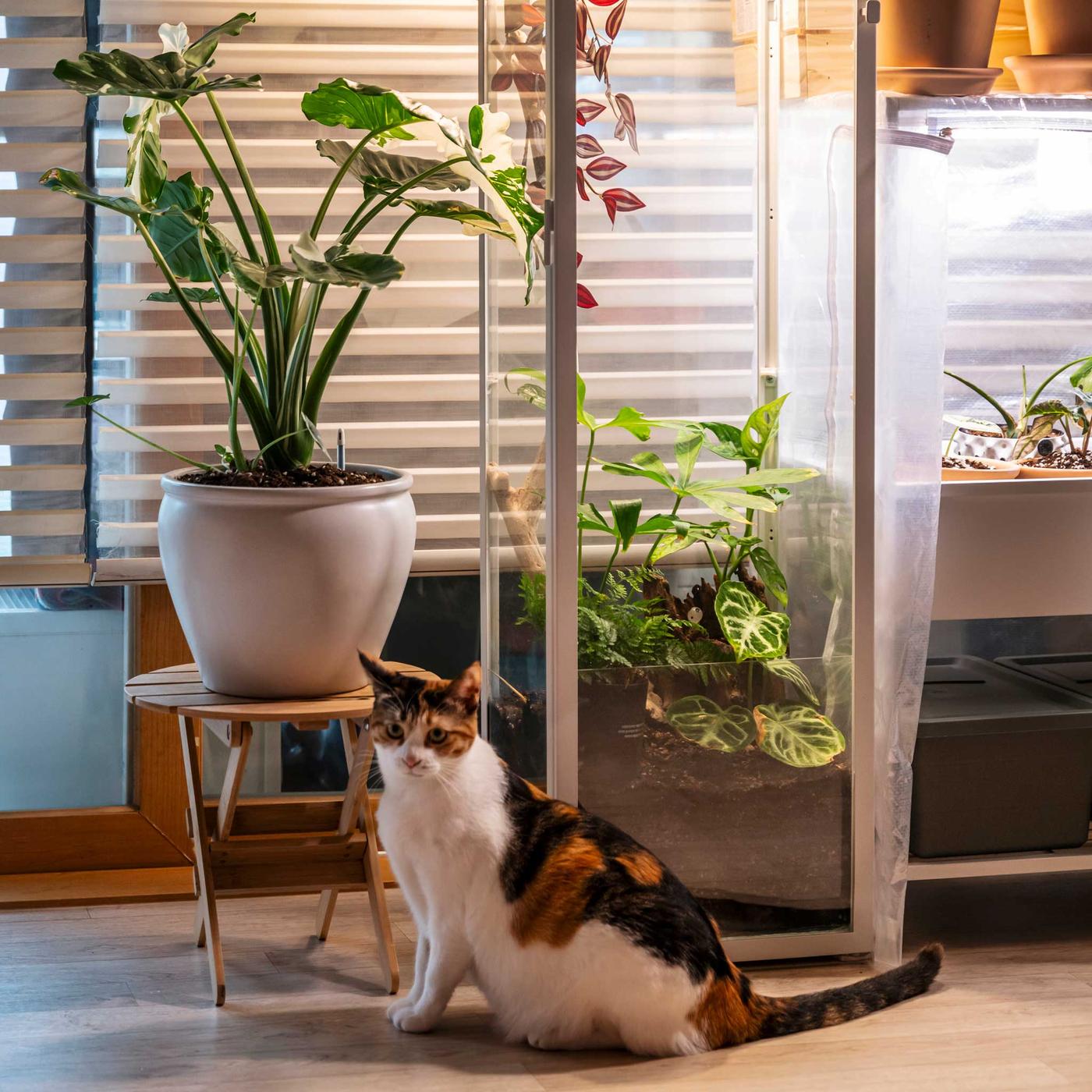 저는 그리드를 추가했는데, 그리드에는 행잉 식물을 거치하거나 가위, 분무기 등의 도구를 걸어 보관하기 좋아요. 고양이들이 화분 쪽으로 넘어오는 것도 막아주는 역할도 해주고요. 그리고 만약 집에 좀 디자인이 아쉬운 화분이 있다면, 해초 바구니나 대나무 화분 제품으로 살짝 가리는 방법도 추천합니다.