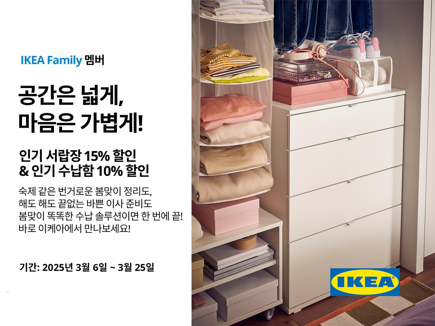 행사 기간 이케아의 무료 멤버십 프로그램 ‘이케아 패밀리’ 및 ‘이케아 비즈니스 네트워크’ 멤버에게는 침실 정리정돈을 위한 행사 대상 서랍장, 수납함을 각각 15%, 10% 할인된 혜택으로 제공한다.