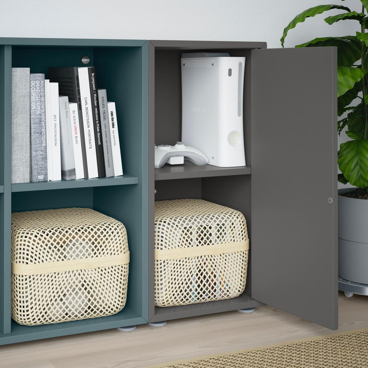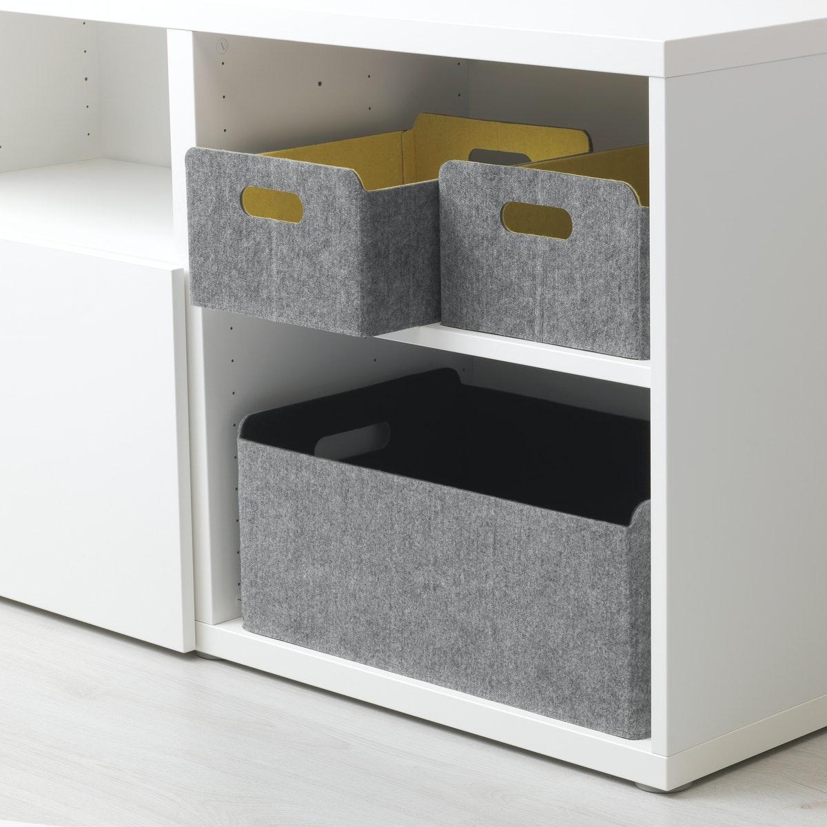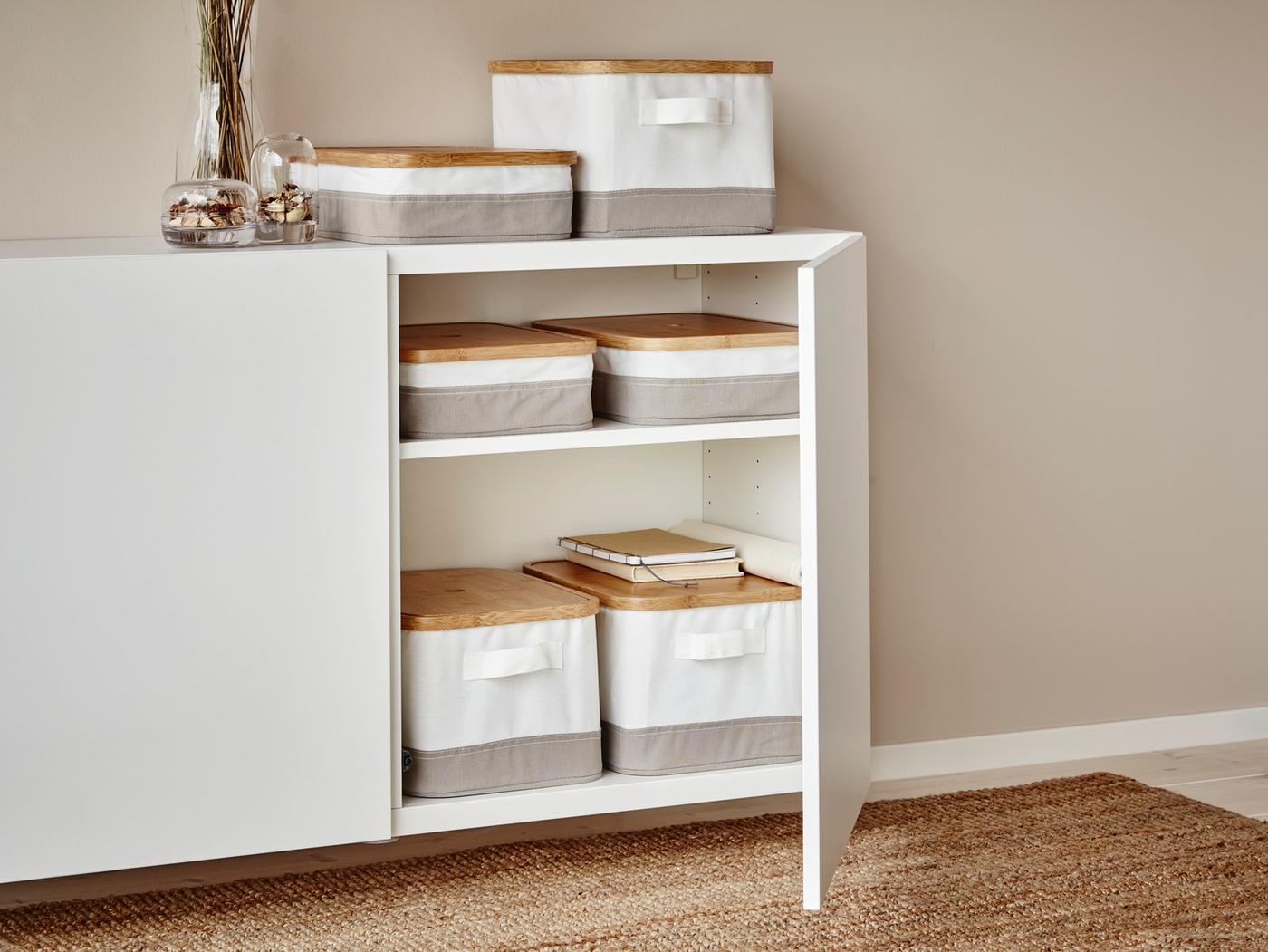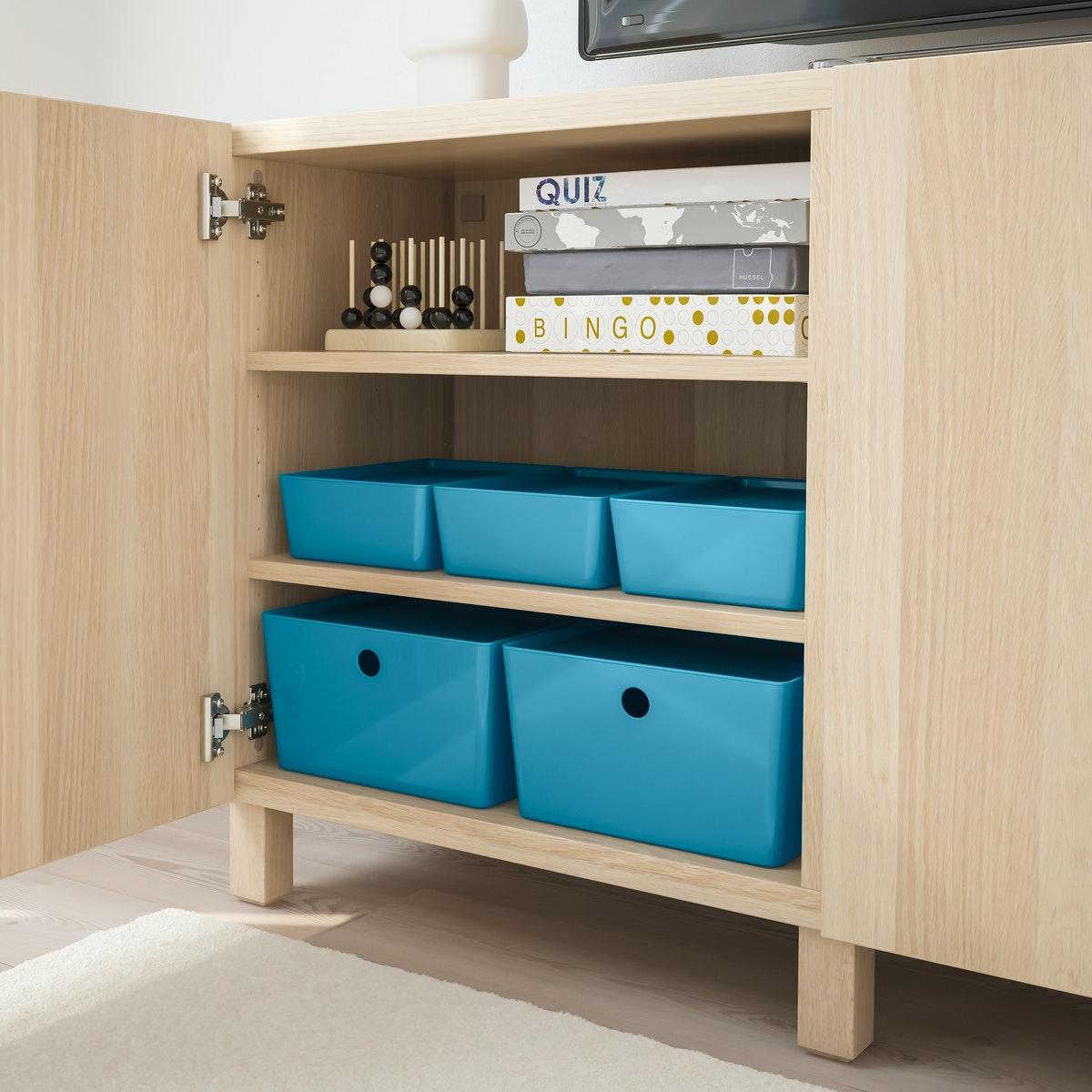 Storan pelbagai guna. Cari tempat yang rapi untuk menyimpan seluruh koleksi buku, filem, majalah dan permainan anda, dengan kotak penyimpanan dan bakul yang direka khas untuk BESTÅ.