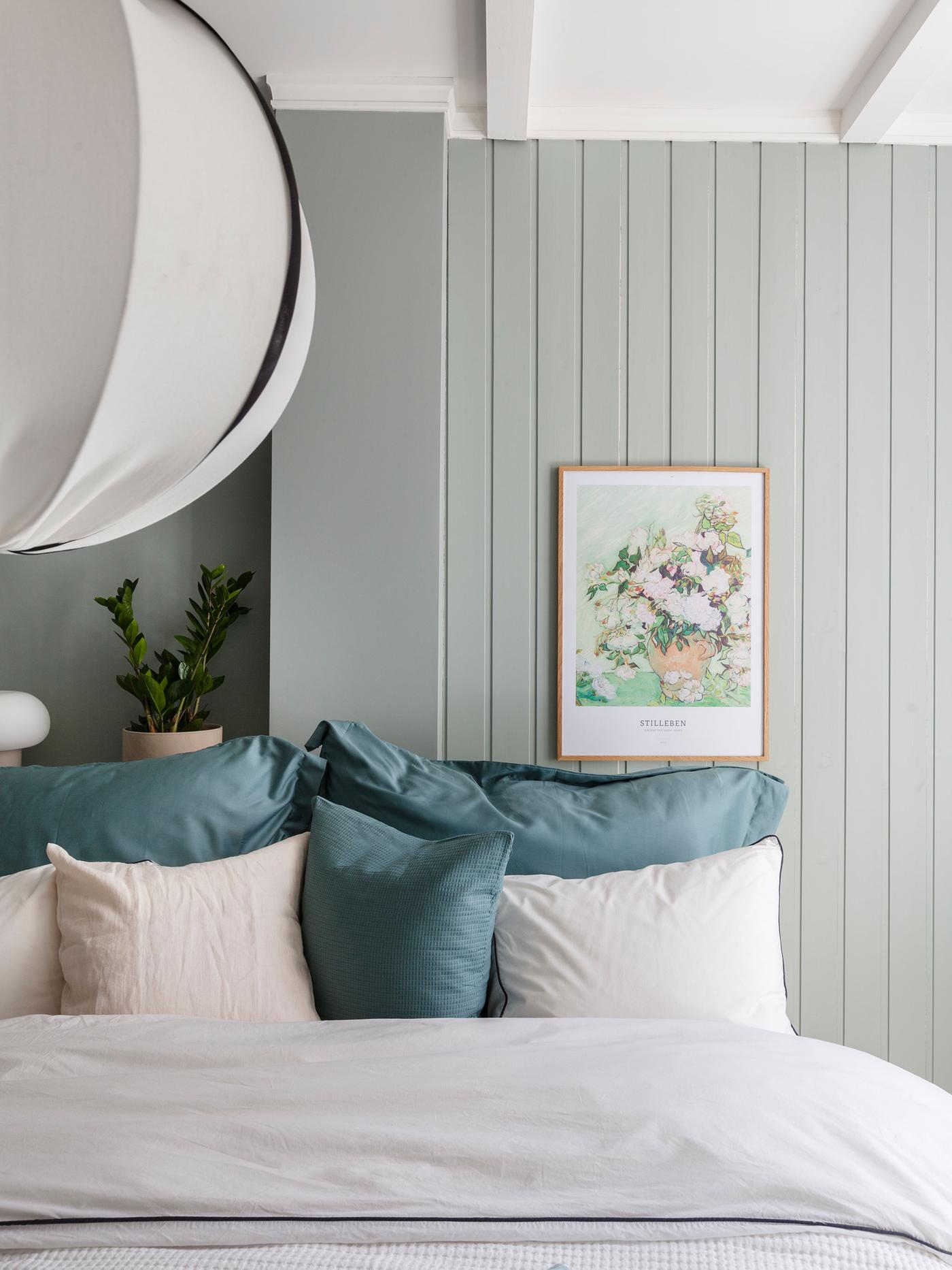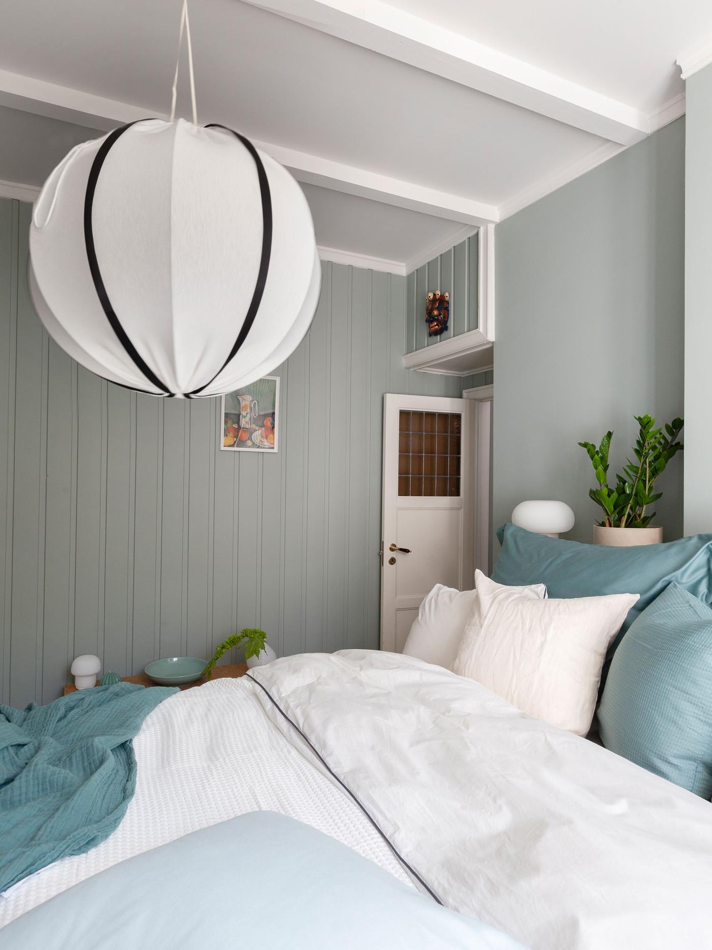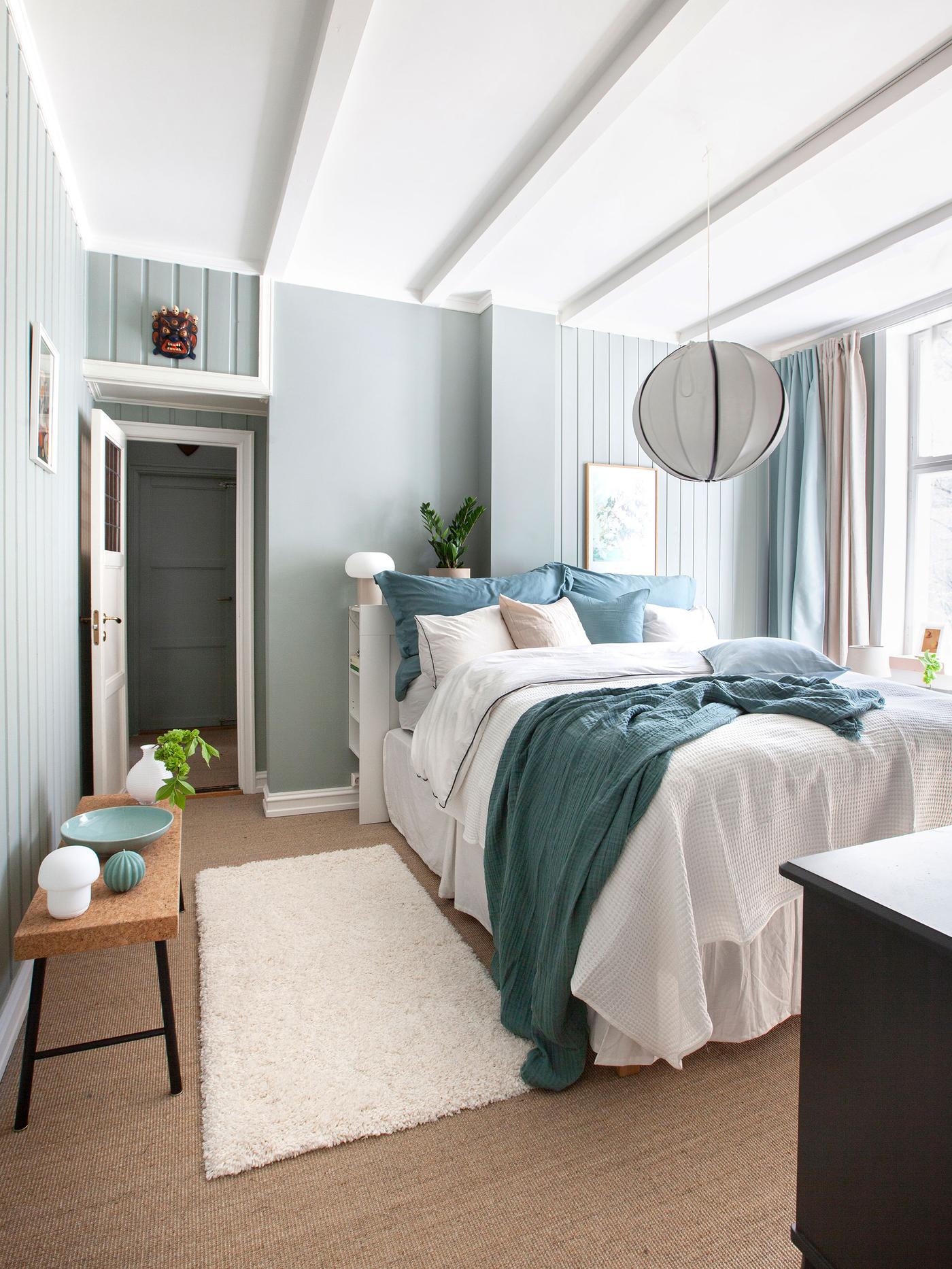 Med dempet blått eller grønt på soverommet trår du ikke feil. Begge fargene oppleves beroligende og avslappende for øyet, og stimulerer til ro og harmoni. Paret som bor her ønsket seg et svalt og delikat soverom, og valget falt på veggfargen Minty Breeze Jotun Lady. Det er egentlig en dempet mintfarge, men i dette rommet slår den mer ut et sted mellom dempet blått og grønt.