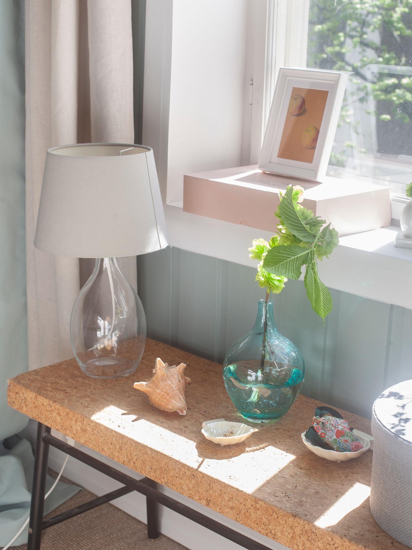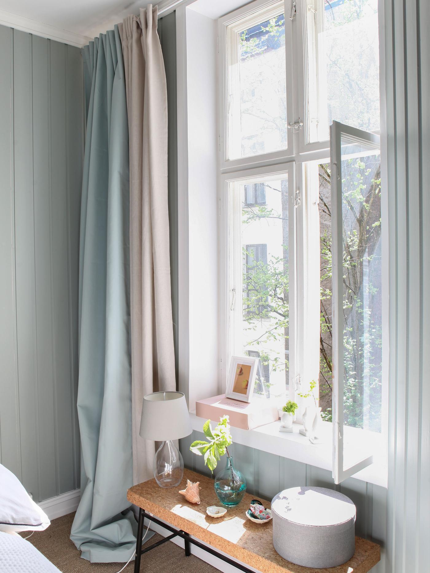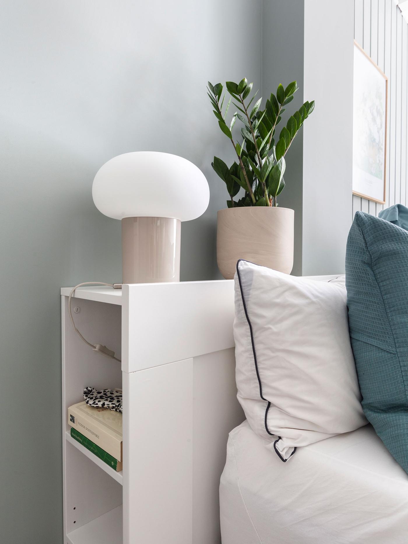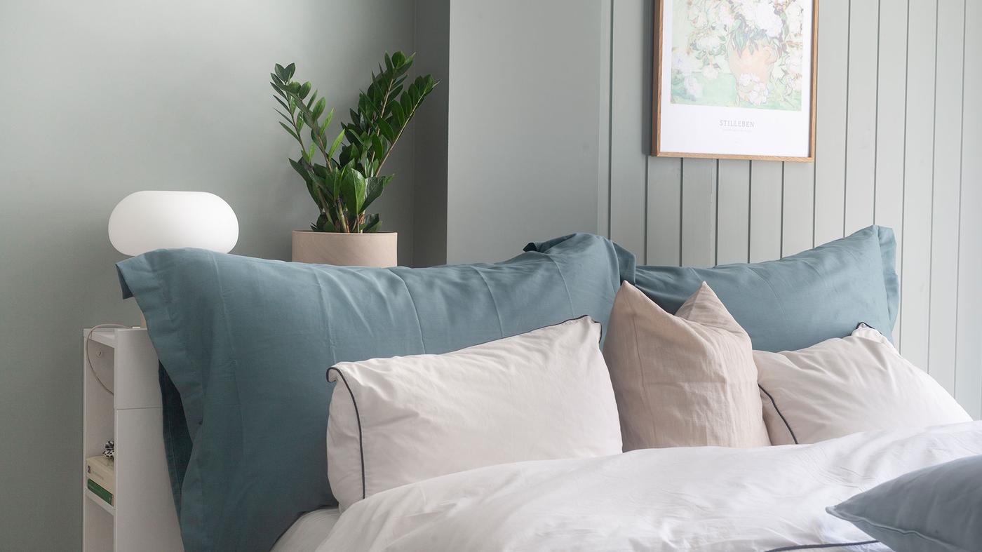 Med dempet blått eller grønt på soverommet trår du ikke feil. Begge fargene oppleves beroligende og avslappende for øyet, og stimulerer til ro og harmoni. Paret som bor her ønsket seg et svalt og delikat soverom, og valget falt på veggfargen Minty Breeze Jotun Lady. Det er egentlig en dempet mintfarge, men i dette rommet slår den mer ut et sted mellom dempet blått og grønt.