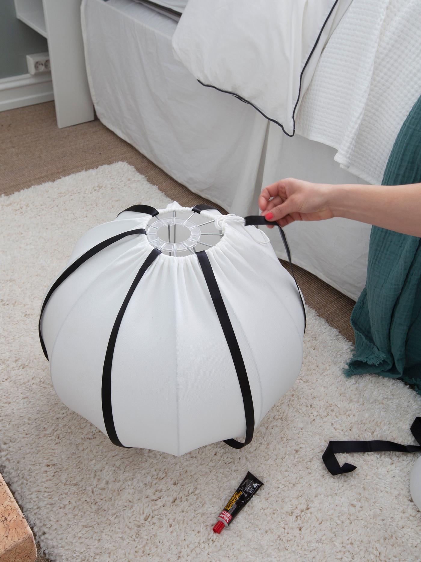 - Lim silkebåndet i lampens sømmer, vi valgte annenhver skjøt, men det kan også være fint på alle.
