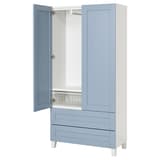 Obudowy PLATSA są białe i proste, więc łatwo dopasują się do stylu innych mebli w pokoju. Złożysz je prosto bez użycia narzędzi, dzięki kilku „kliknięciom”. Możesz wybrać zamknięte korpusy, otwarte półki lub łączyć rozwiązania w zależności od potrzeb. Dobierz oświetlenie szafy, aby ułatwić sobie szukanie przedmiotów w szafie.