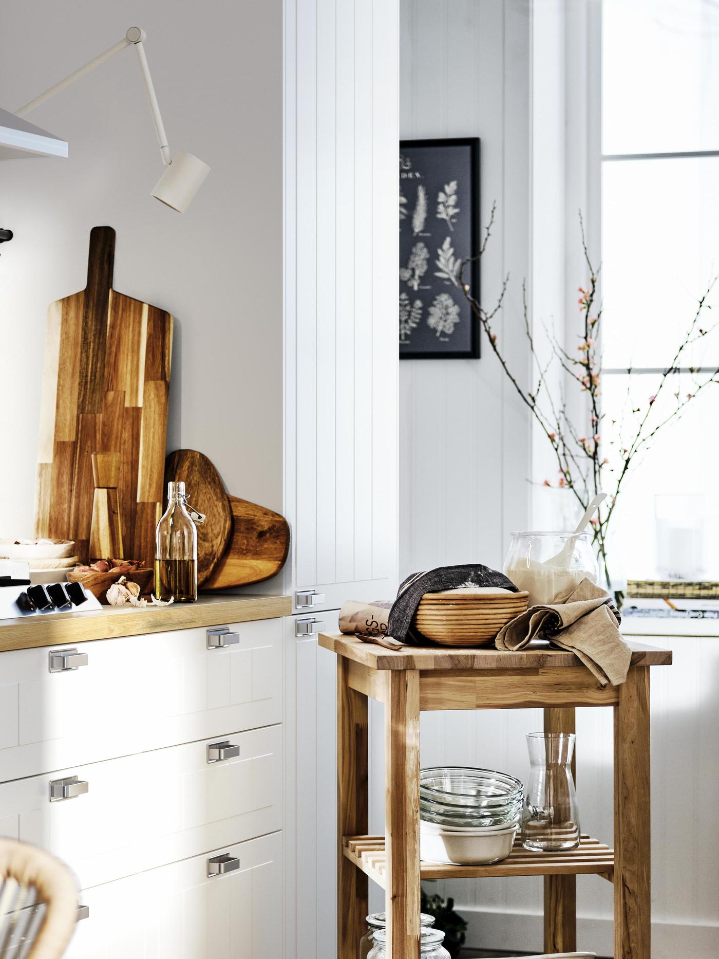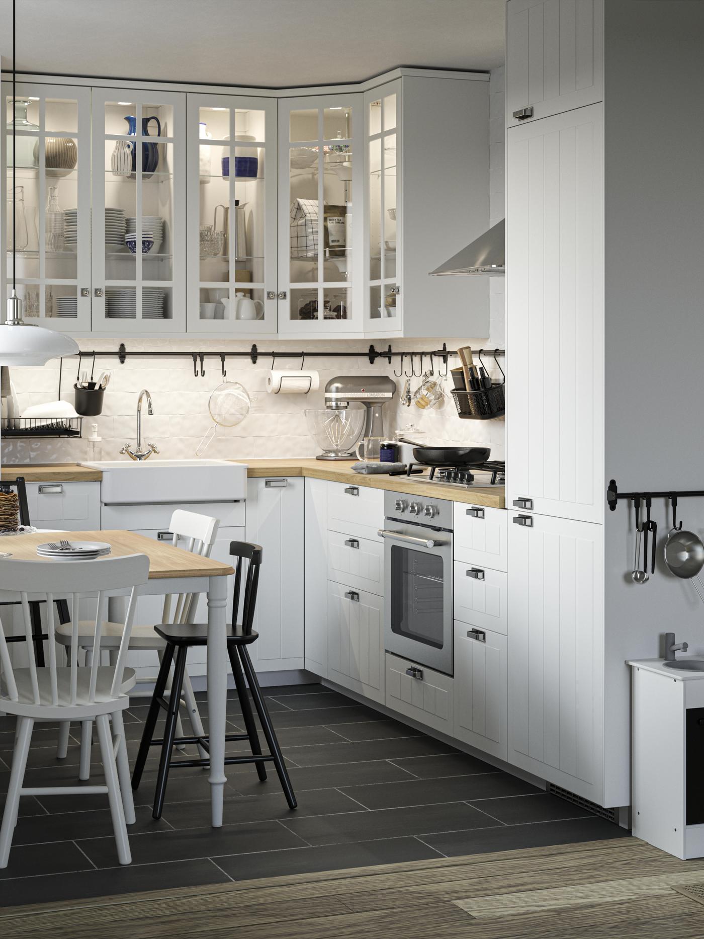 - Blaty robocze i przeszklone szafki optycznie powiększają wnętrze.