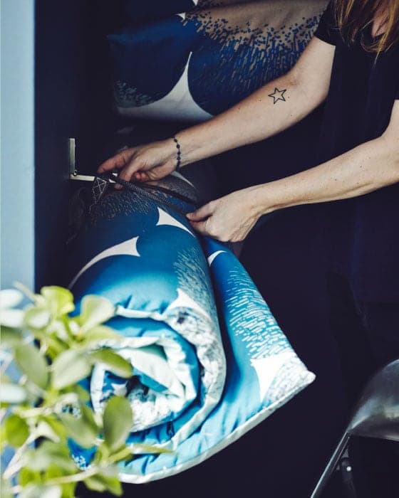 Gotowe! Wystarczy do środka włożyć materac. Gdy już wypoczniesz, proponujemy zwinąć materac i związać sznurkiem lub paskiem dla łatwiejszego przechowywania.
