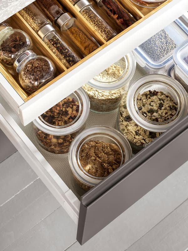 - W górnych szafkach przechowuje się lekkie produkty i rzadziej używane przedmioty.