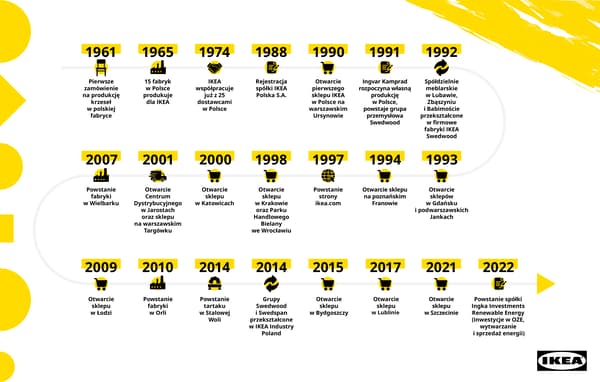 Ingvar Kamprad zwykł mawiać, że „IKEA powstała w Polsce”. Początek tej długiej i pięknej historii miał miejsce w 1961 roku, kiedy złożył on pierwsze zamówienie na zakup krzeseł ÖGLA w fabryce w Radomsku. Obecnie Polska jest jednym z największych partnerów biznesowych firmy w Europie, a co piąty produkt IKEA na świecie powstaje w polskiej fabryce.