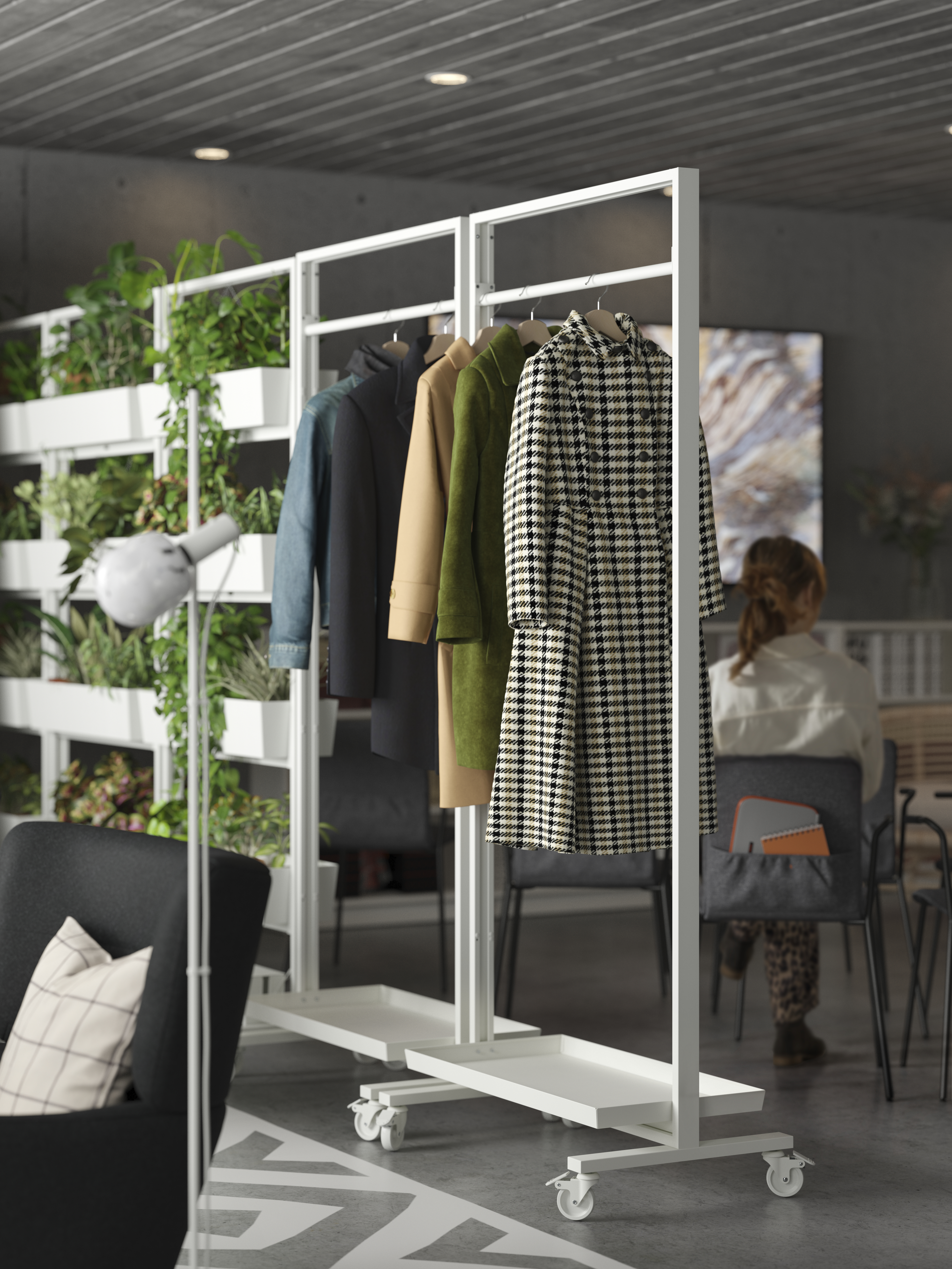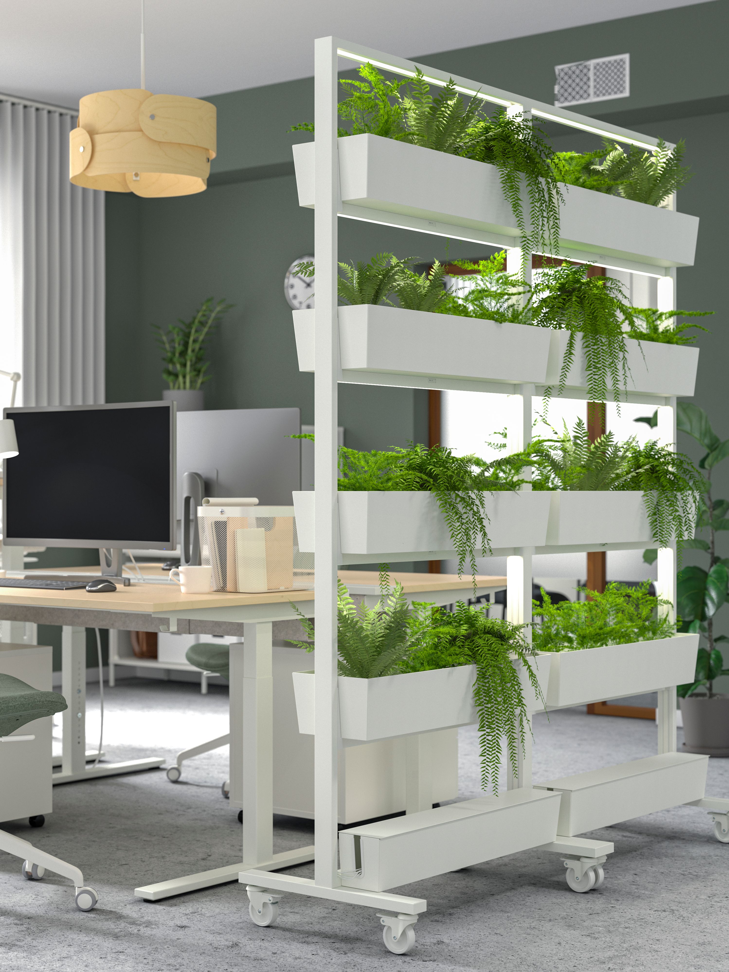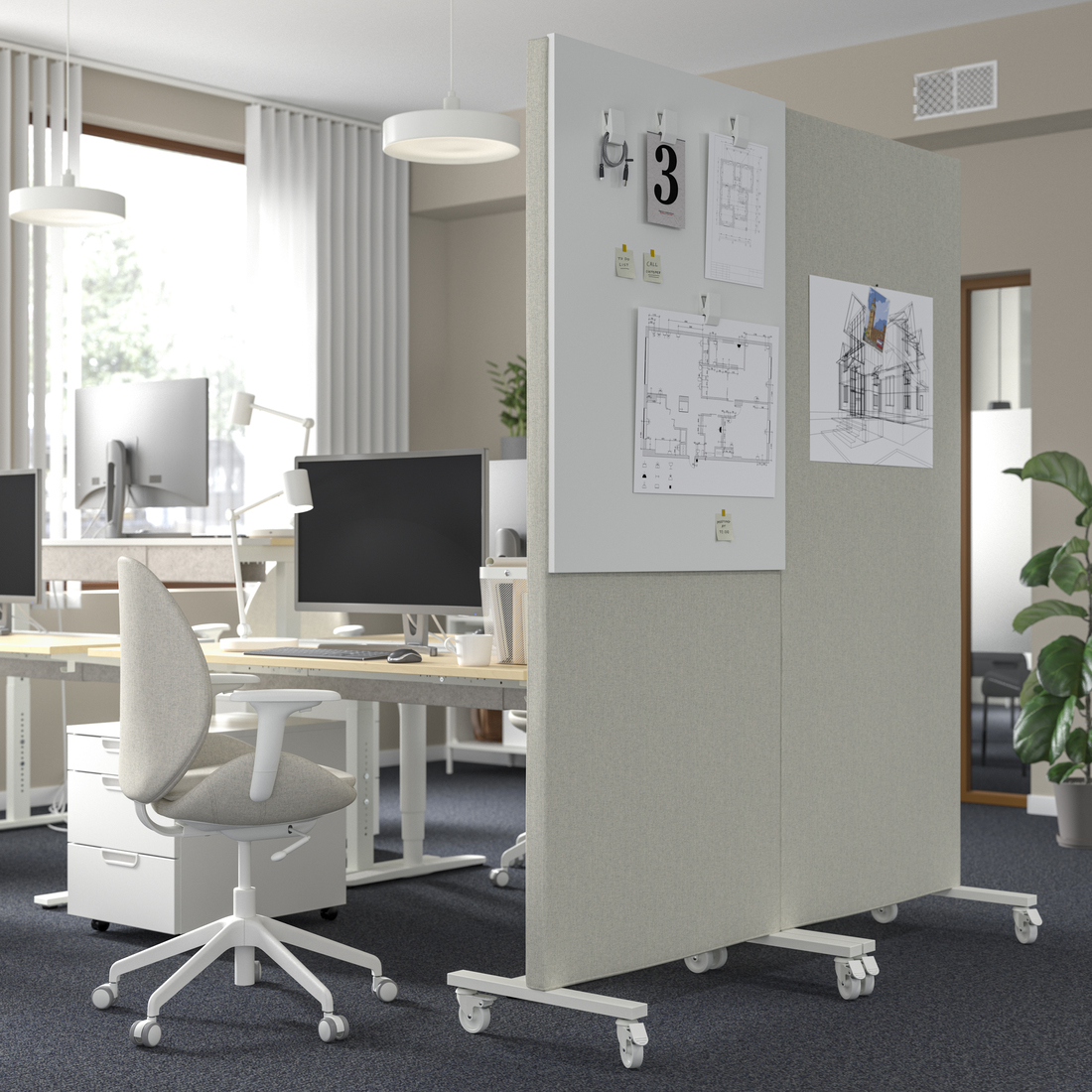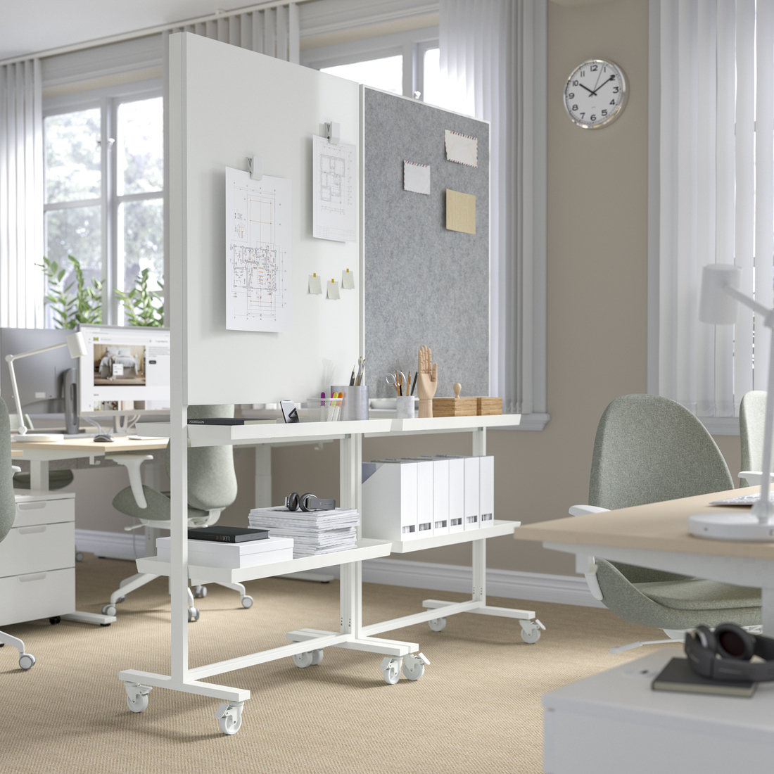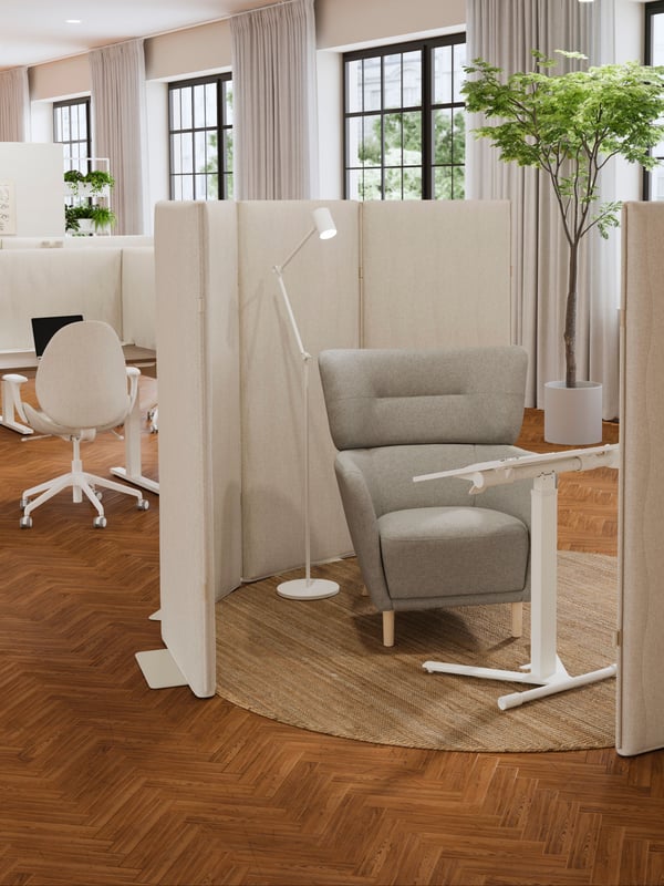 Ramy na kółkach oraz ekrany akustyczne MITTZON zapewniają prywatność i idealne warunki do warsztatów i spotkań. Łatwo je przesunąć, dzięki czemu miejsce do pracy stanie się bardziej elastyczne i dynamiczne. Jak każdy produkt IKEA, seria biurowa odznacza się wyjątkową funkcjonalnością. Pokrycie ekranu akustycznego można zdjąć i uprać w pralce, a ramy na kółkach mogą posłużyć również jako kwietniki lub tablice do tworzenia notatek. Te sprytne rozwiązania stłumią hałas i oddadzą głos kreatywności.
