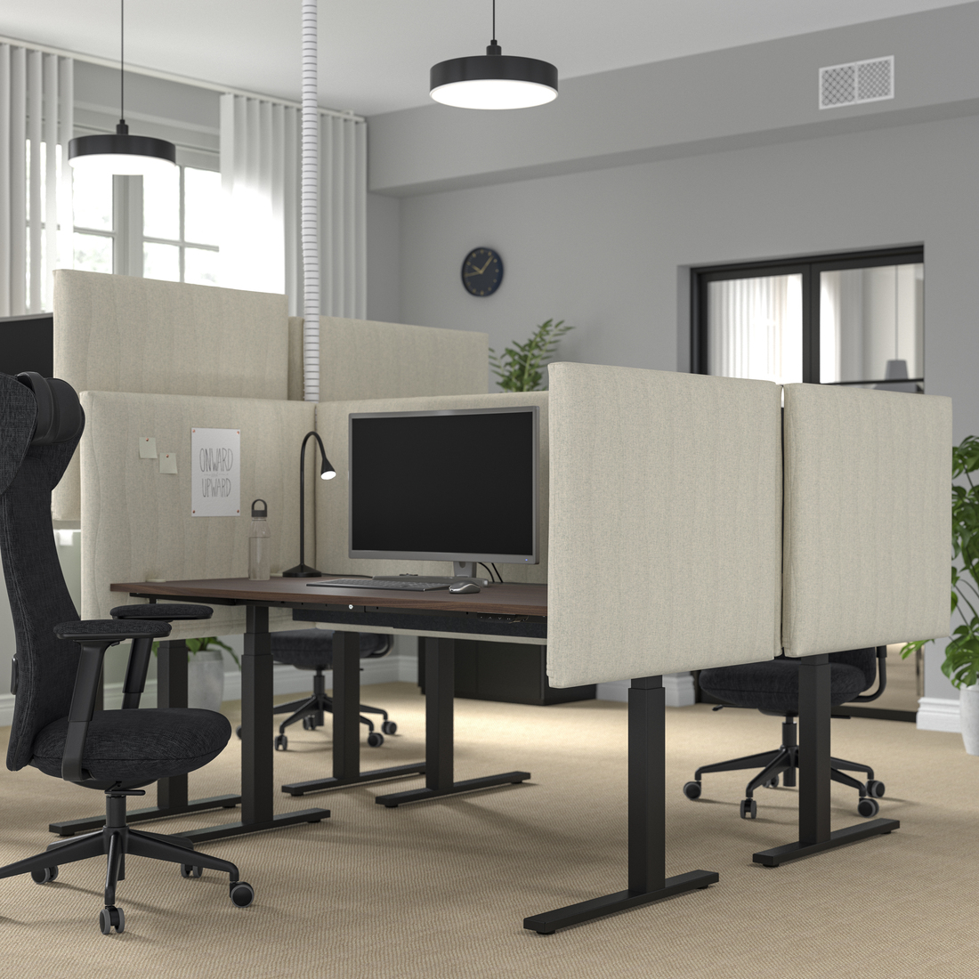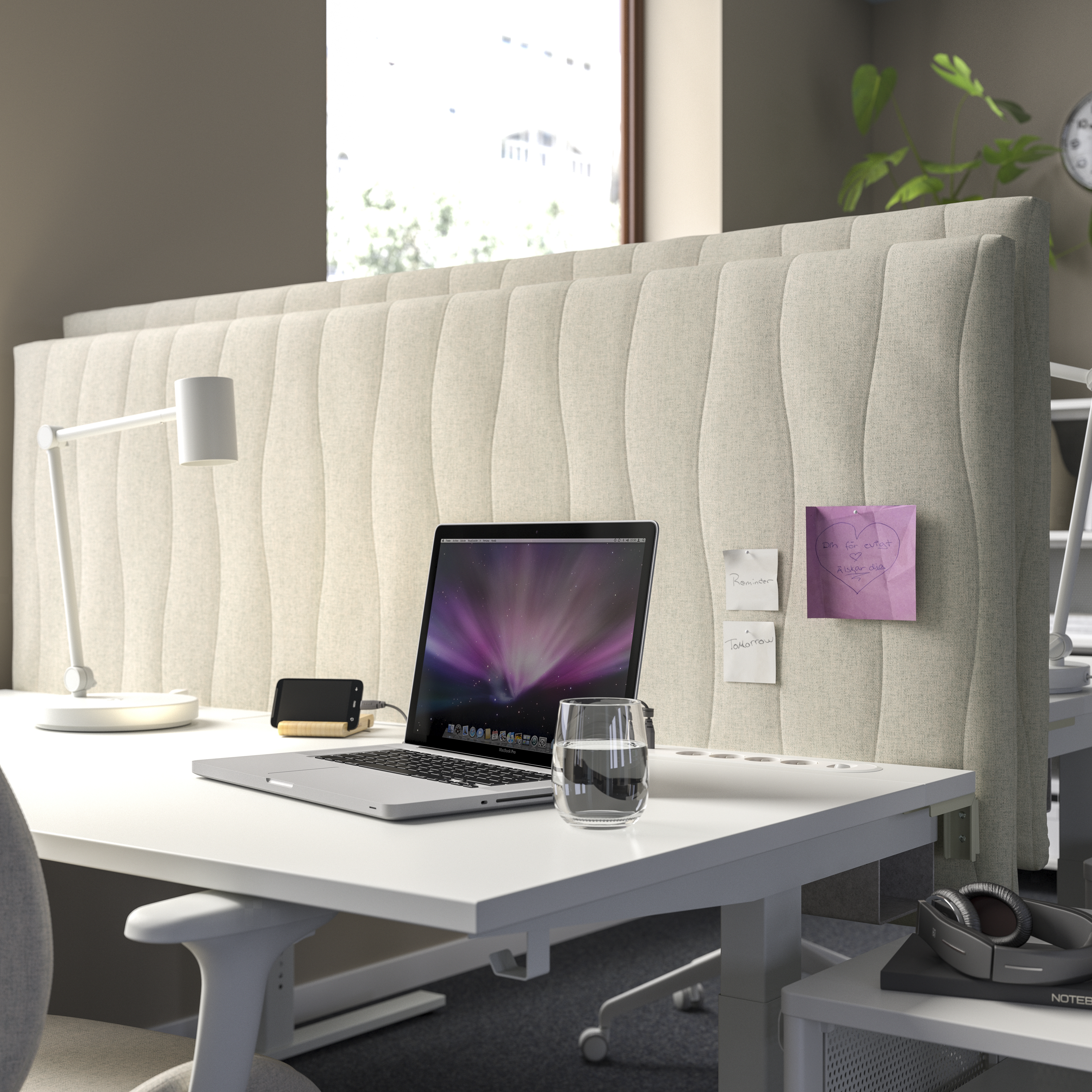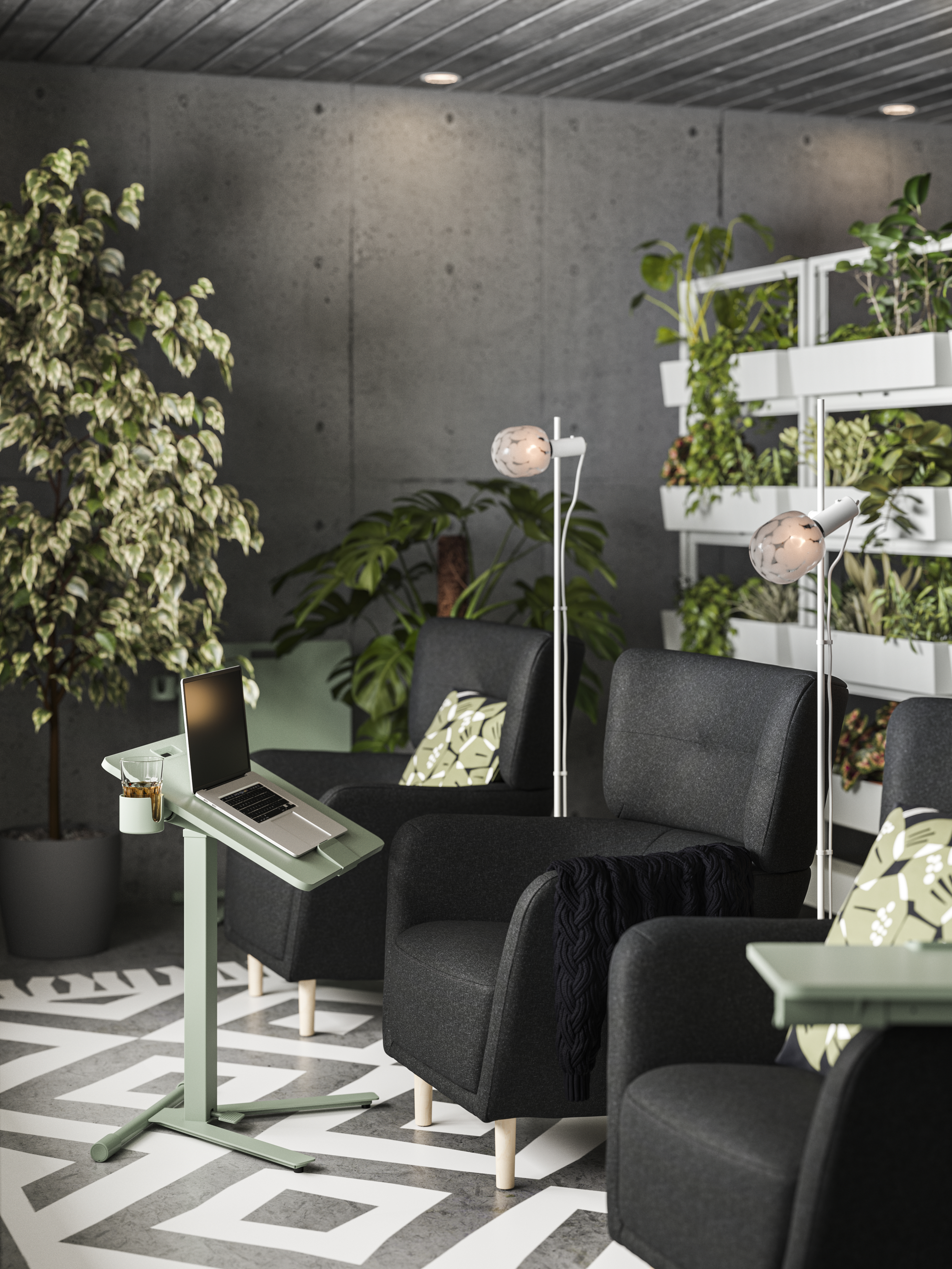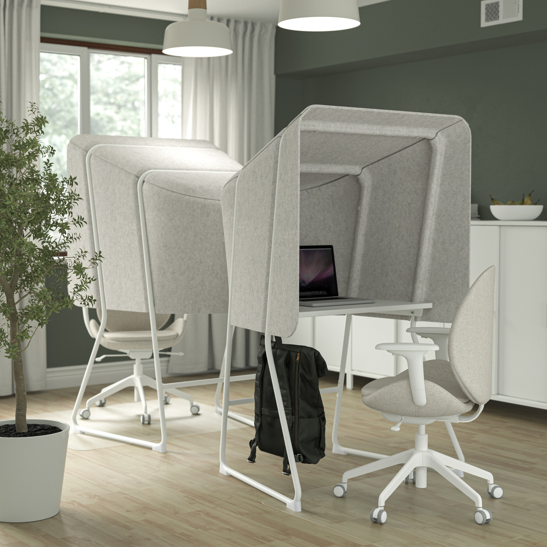 Ramy na kółkach oraz ekrany akustyczne MITTZON zapewniają prywatność i idealne warunki do warsztatów i spotkań. Łatwo je przesunąć, dzięki czemu miejsce do pracy stanie się bardziej elastyczne i dynamiczne. Jak każdy produkt IKEA, seria biurowa odznacza się wyjątkową funkcjonalnością. Pokrycie ekranu akustycznego można zdjąć i uprać w pralce, a ramy na kółkach mogą posłużyć również jako kwietniki lub tablice do tworzenia notatek. Te sprytne rozwiązania stłumią hałas i oddadzą głos kreatywności.