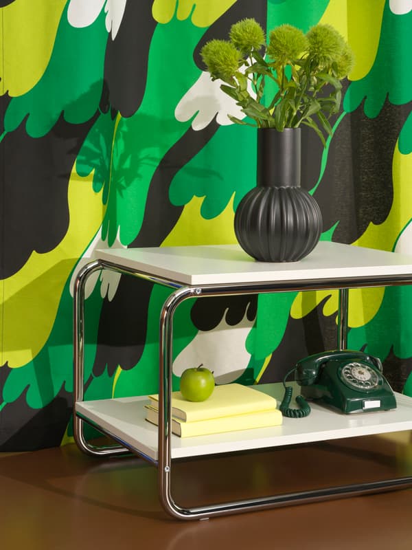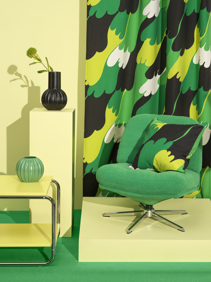 Tkaniny, dywany oraz dodatki w nowej kolekcji Nytillverkad przeniosą nas do czasów, kiedy w wystroju wnętrz królowały śmiałe wzory i kolory, oferując jednocześnie współczesne wykończenie. Tkanina ÄNGSFIBBLA autorstwa Svena Fristedta, która po raz pierwszy pojawiła się na rynku w 1971 roku, jest nie tylko kultowa, ale również nadal niezwykle modna w swojej prostocie i fantazyjności. Dostępna w zielonych, czarnych i białych kolorach tkanina pozwala stworzyć dżunglę w domowym zaciszu.