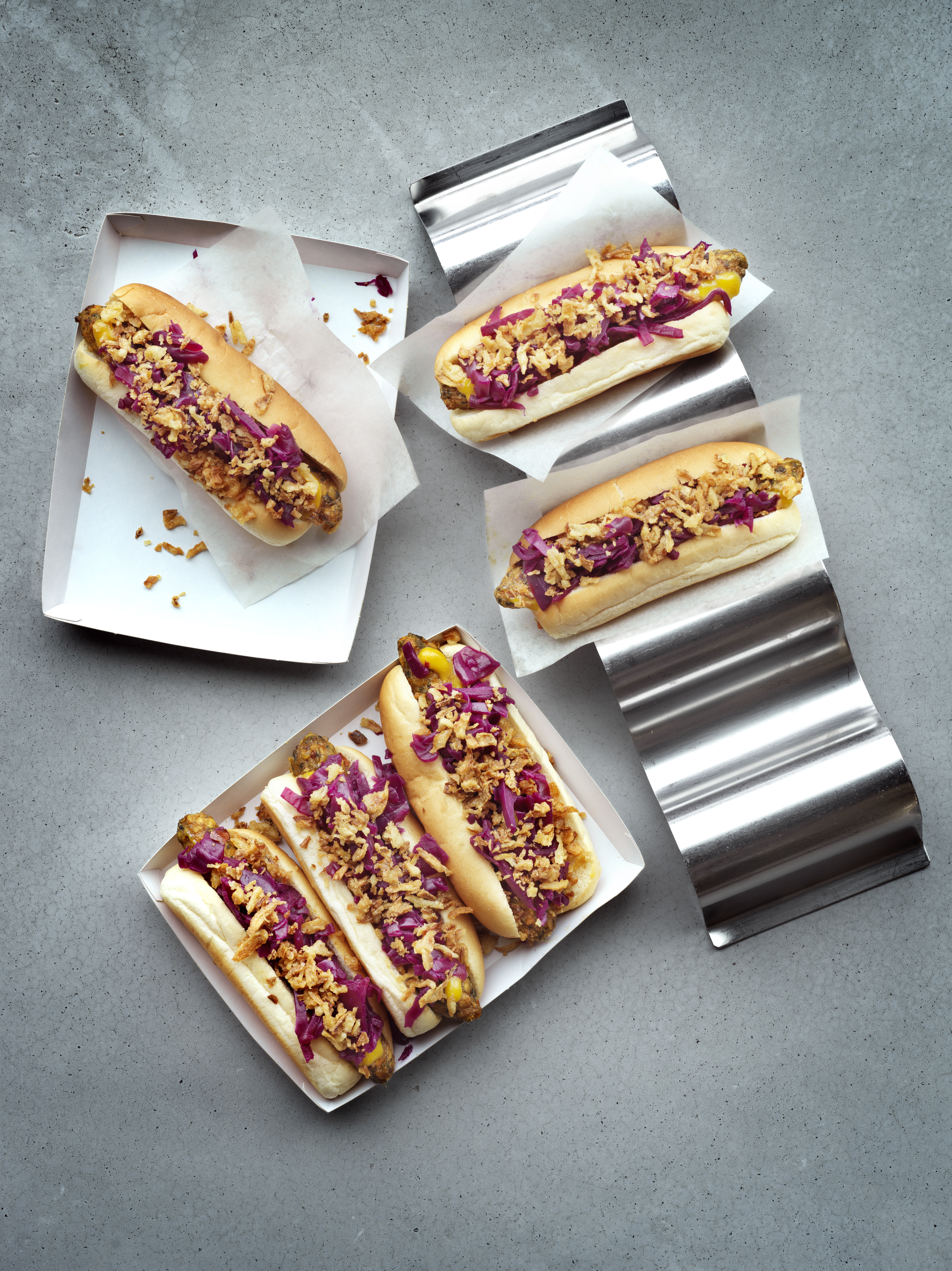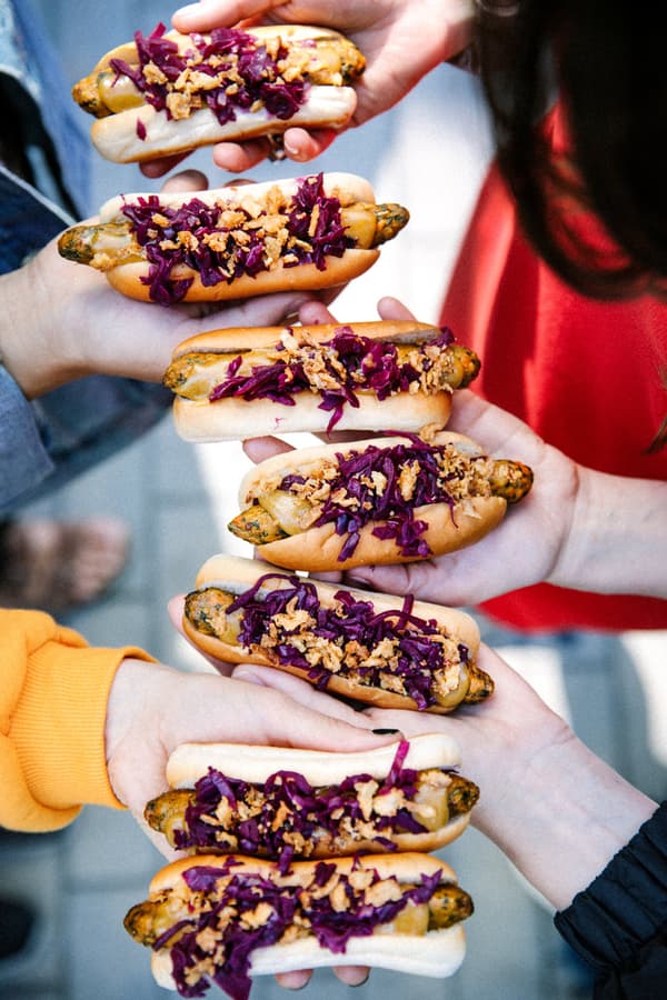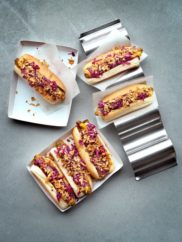 Właśnie dlatego, skład wege hot doga oparty jest na roślinach. Główne składniki wege hot doga to: jarmuż, czerwona soczewica, komosa ryżowa, cebula, marchew, ziemniaki oraz przyprawy takie jak imbir, kurkuma, sól i pieprz. Hot dog w wersji wegetariańskiej będzie serwowany z dodatkami w postaci słodko-pikantnej musztardy, marynowanej czerwonej kapusty oraz prażonej cebulki.