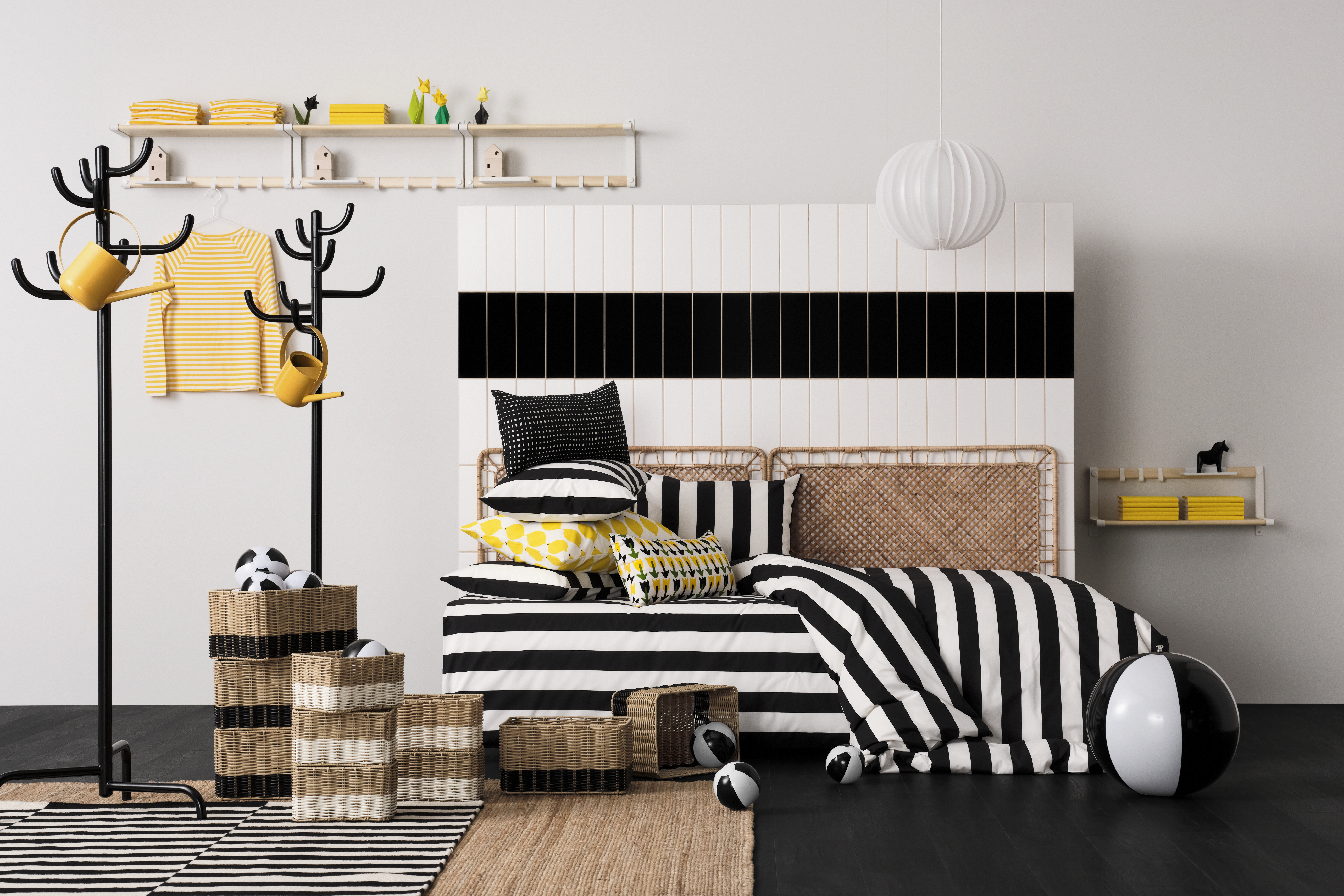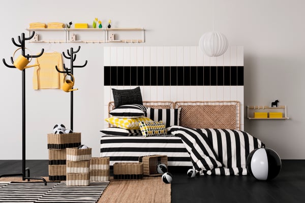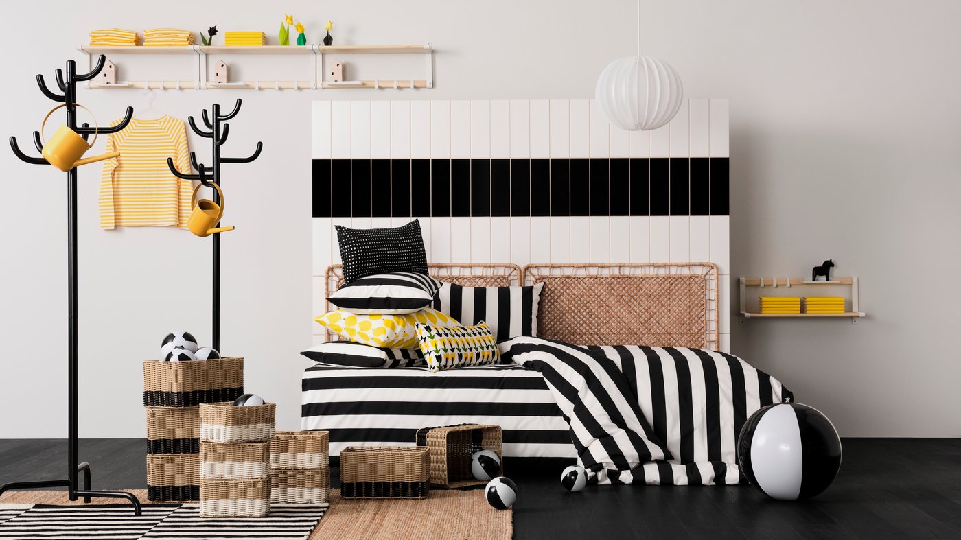 Mocna czarno-biała baza, geometryczne wzory i dodatek soczystego cytrusowego koloru w nowej pościeli i poduszkach to idealny sposób na przebudzenie domu po zimowym śnie. Obraz PJÄTTERYD to prawdziwe dzieło godne muzeum sztuki współczesnej, które nada wnętrzu charakteru. Dynamizm i nasycone kolory tworzą wyrazisty manifest kreatywności, będący dowodem na to, że sztuka może być prosta, a jednocześnie niezwykle efektowna. To idealny dodatek do nowoczesnych i klasycznych wnętrz.