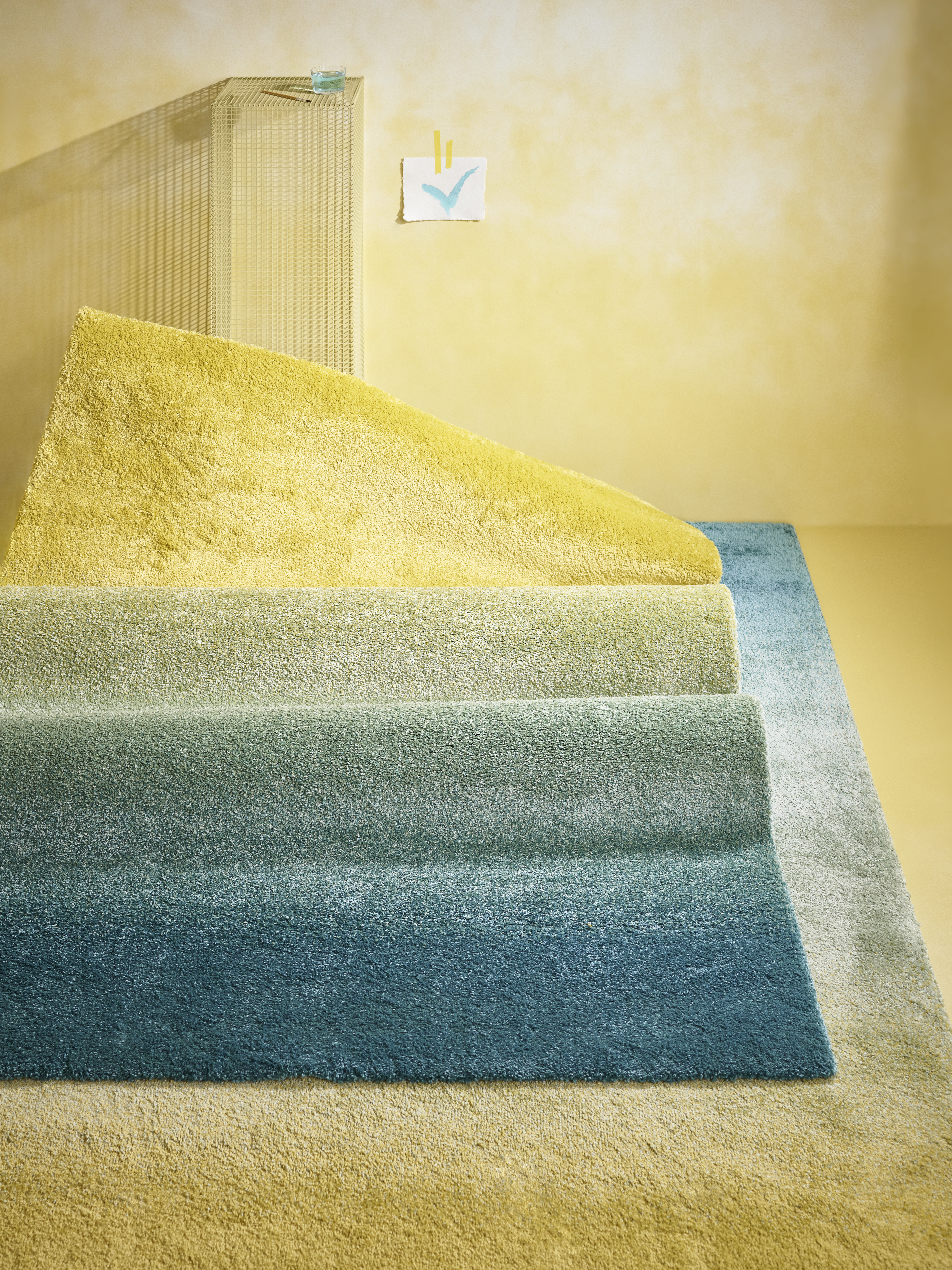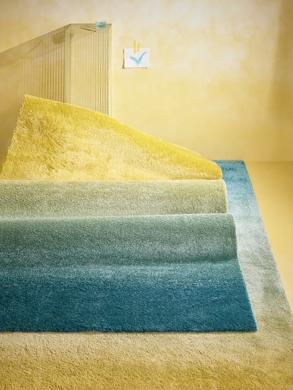 Dywan HOTELLRUM ożywi i rozświetli wnętrze domu. W sypialni stworzy przytulną atmosferę sprzyjającą snom o plaży i morzu, w salonie stanie się centralnym punktem wystroju, a w pokoju dziecięcym zapewni miękką i bezpieczną przestrzeń do zabawy. Żółte pastelowe odcienie przechodzą poprzez zieleń do błękitu, tworząc impresjonistyczny pejzaż, którego widok pobudza wyobraźnie. Wysokie włosie jest wyjątkowo miękkie i sprzyja wytłumieniu hałasu we wnętrzu.