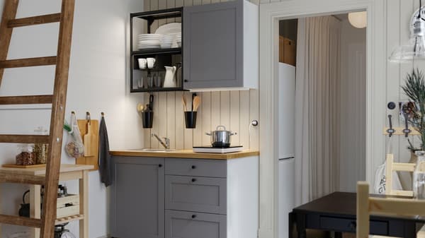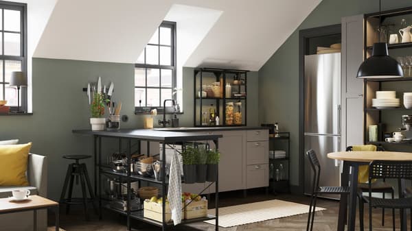 Kuchnia ENHET to niedrogie rozwiązania z kompletnym wyposażeniem i z 10-letnią gwarancją, które mogą się rozwijać i dostosowywać do ciebie oraz twojego stylu życia. Meble mogą być w pełni zabudowane lub składać się z otwartych i zamkniętych półek. Są łatwe w montażu i demontażu.