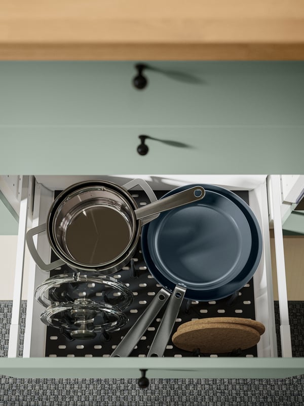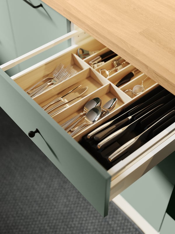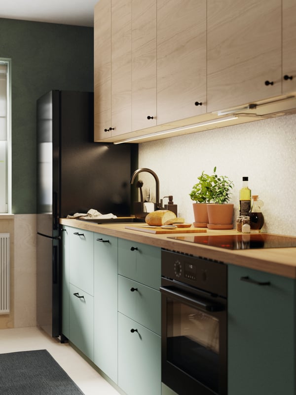 Ta nieduża kuchnia łączy w sobie kojącą zieleń i praktyczne rozwiązania, które ułatwią codzienne gotowanie i segregację odpadów. Zainspiruj się nową aranżacją kuchni METOD z frontami BODARP i VOXTORP.