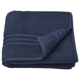 A green VALLASÅN towel with a textured waffle pattern and fringed edges, folded neatly. Its made from a soft cotton and viscose blend.Green VALLASÅN towel on shower rack. Rectangular, textured, fringed ends.