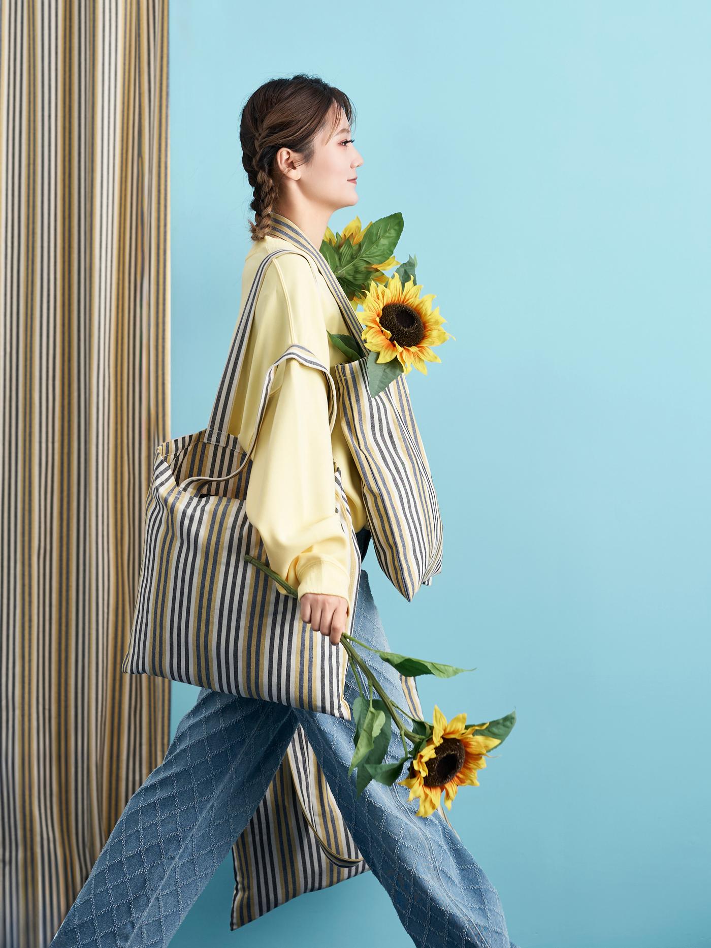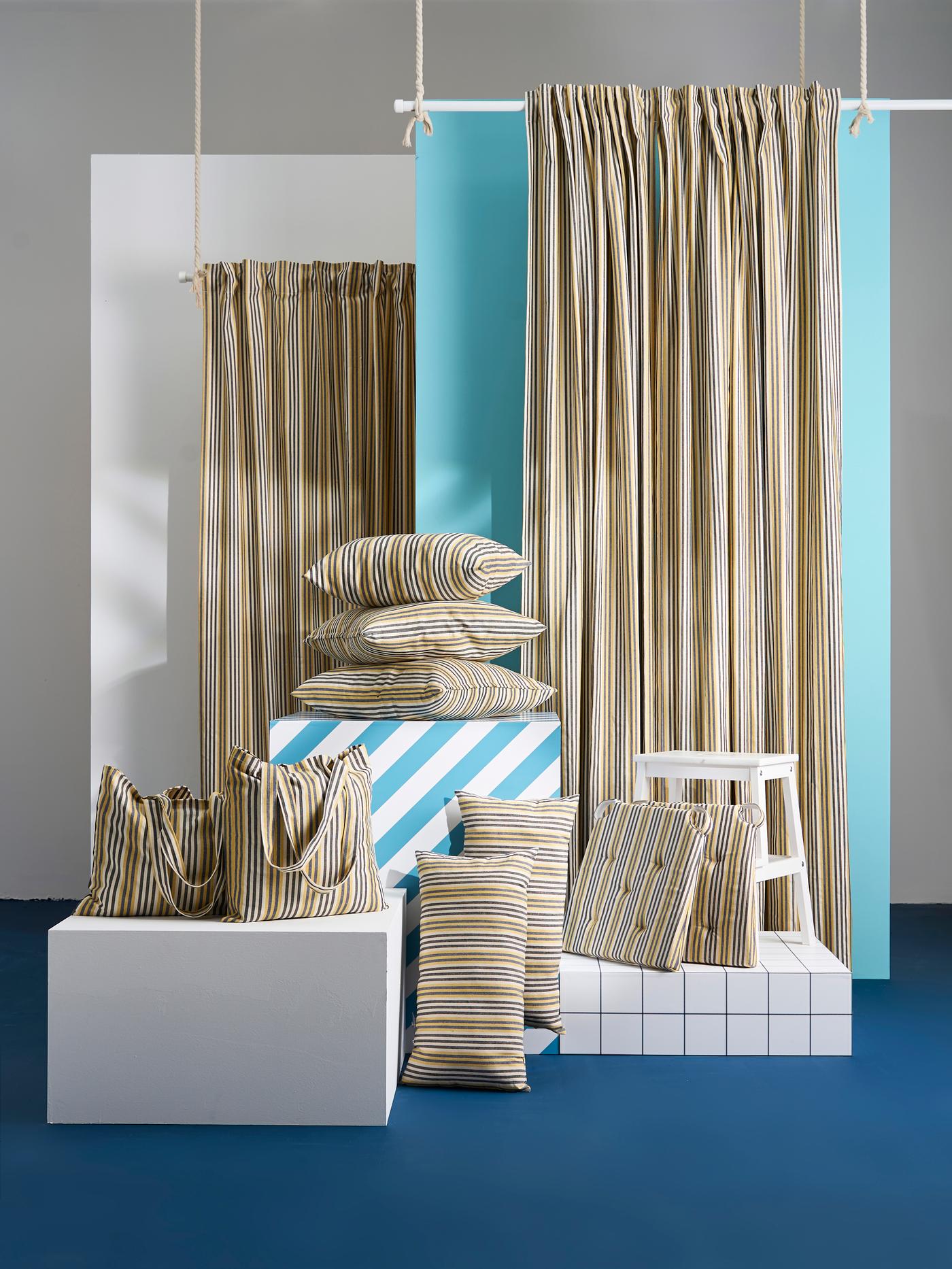 Giving a new life to recycled textile materials was not easy, Any colour can be created by dyeing, but this often requires various chemicals and large amounts of water. So we used the colours from the material; yellow, blue, white and black the iconic strips, since the BARRMYNTA collection is crafted from unused IKEA co-worker uniforms.