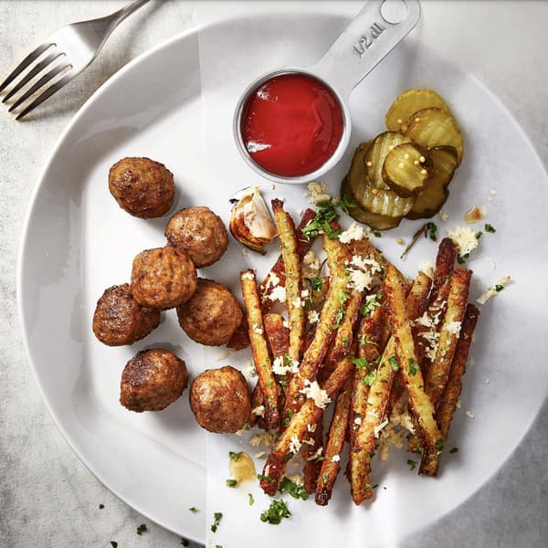 - Serve the plant balls and rösti fries with ketchup and pickled gherkins